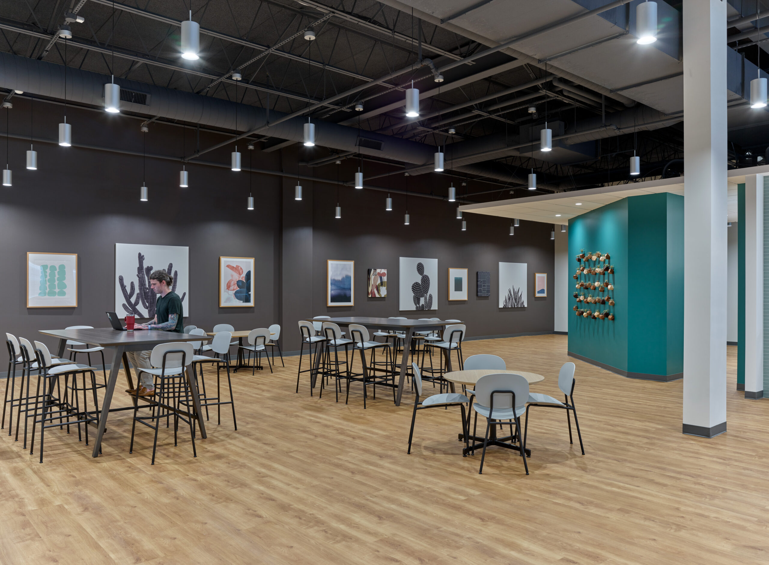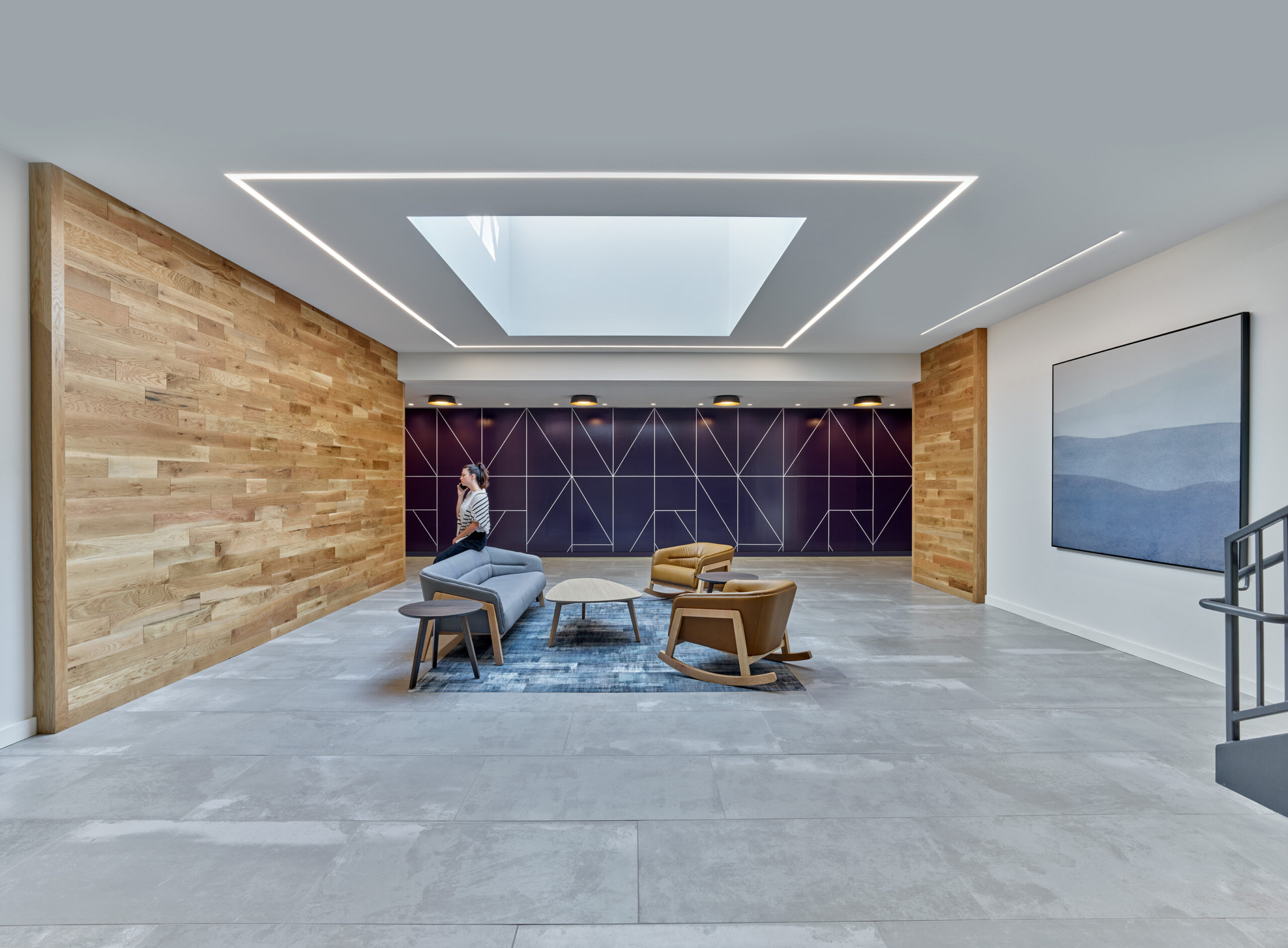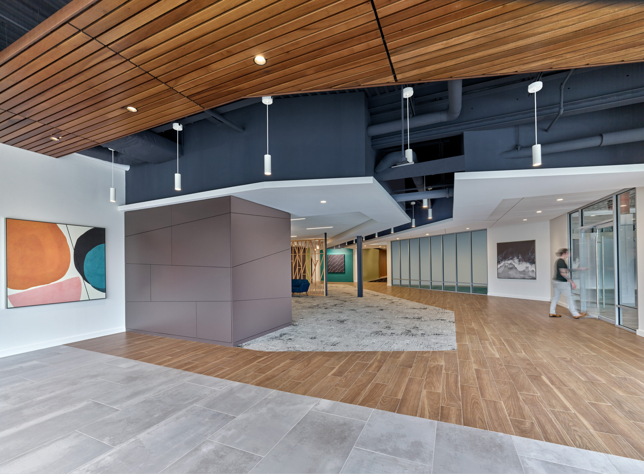 The building’s deep floor plate, spanning over 200,000 square feet, contained circulation paths that were complex. Through the application of mixed materials and ceiling heights, exposed industrial details in the structure, and varied lighting elements, the journey through the building is now full of interest and easy navigation. These transformed pathways lead to the heart of the renovations – a repurposed storage mezzanine now housing a mixed-use amenity center featuring a lounge, café, meeting space, and fitness facility – arranged to spark community, social connection, and wellbeing. Environmental branding deepens the building’s sense of identity, taking cues from the geometric angles, vivid color, and eclectic range of scale and materiality used in the interior design.