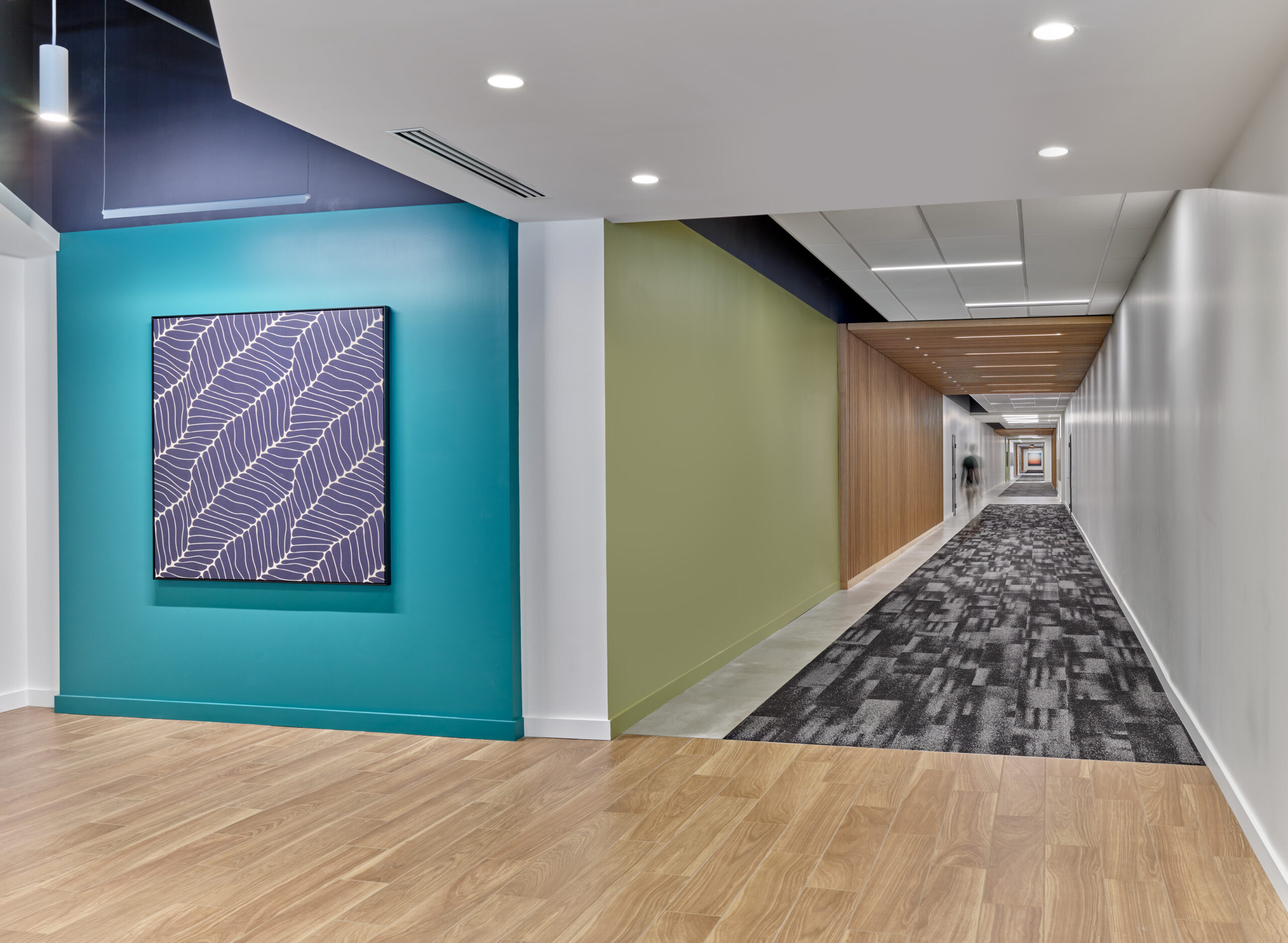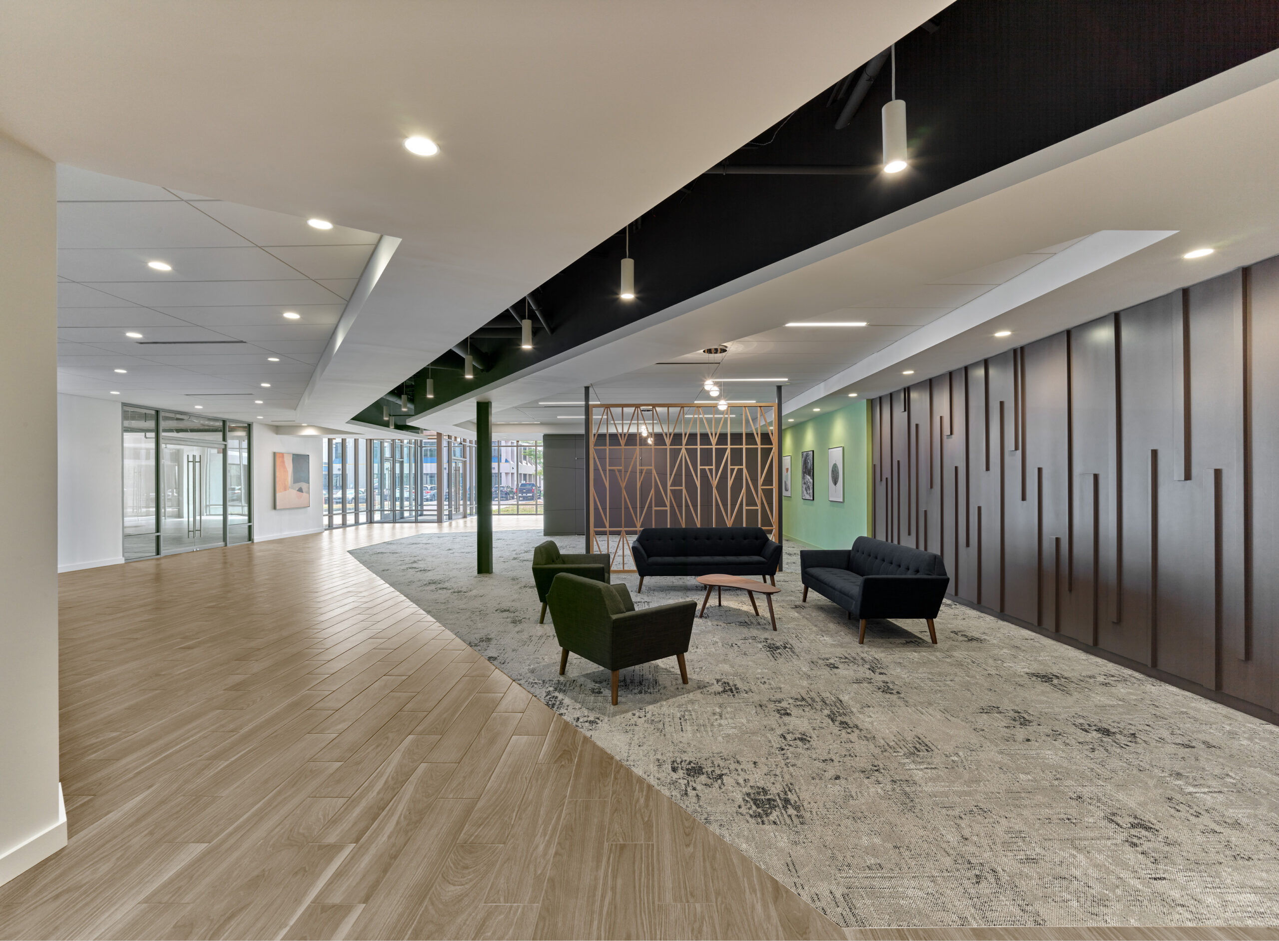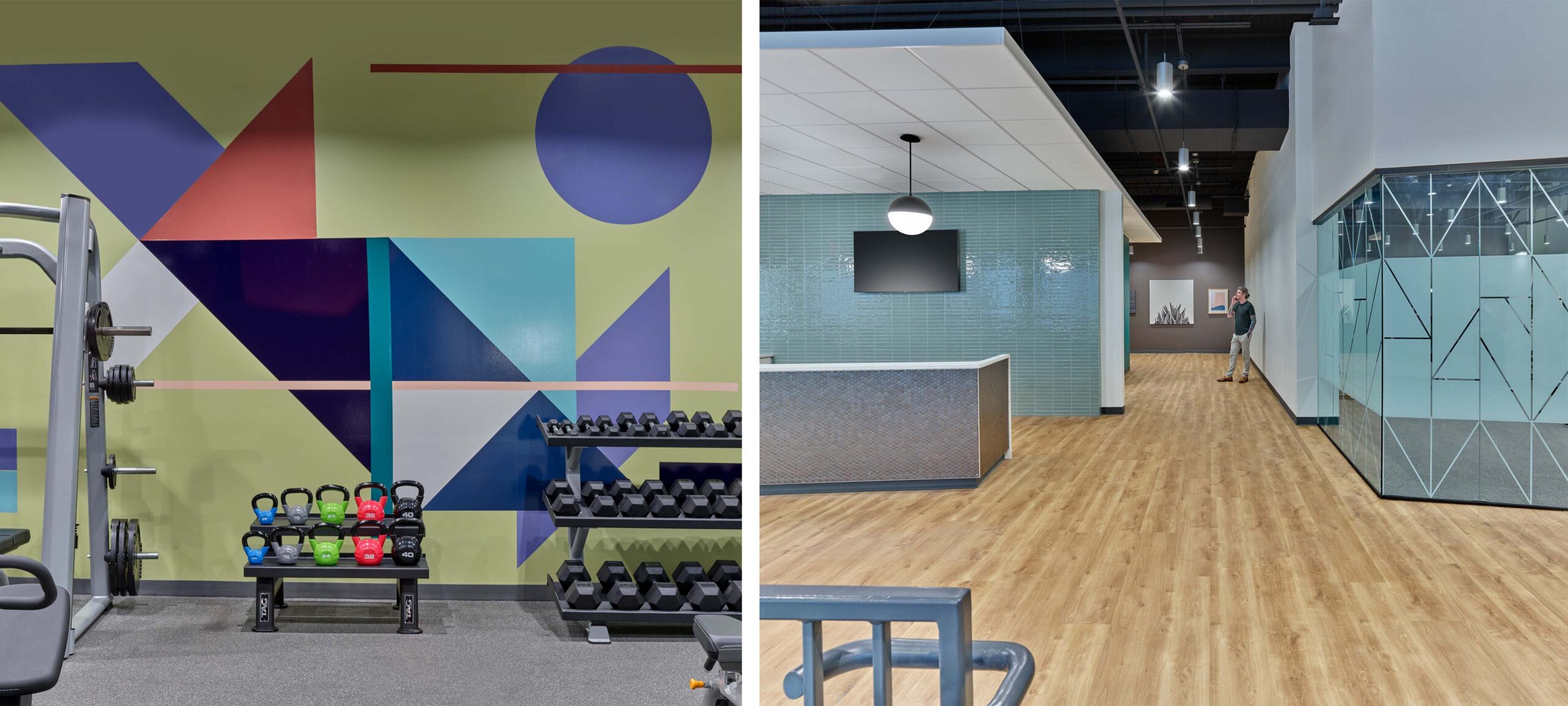 The building’s deep floor plate, spanning over 200,000 square feet, contained circulation paths that were complex. Through the application of mixed materials and ceiling heights, exposed industrial details in the structure, and varied lighting elements, the journey through the building is now full of interest and easy navigation. These transformed pathways lead to the heart of the renovations – a repurposed storage mezzanine now housing a mixed-use amenity center featuring a lounge, café, meeting space, and fitness facility – arranged to spark community, social connection, and wellbeing. Environmental branding deepens the building’s sense of identity, taking cues from the geometric angles, vivid color, and eclectic range of scale and materiality used in the interior design.