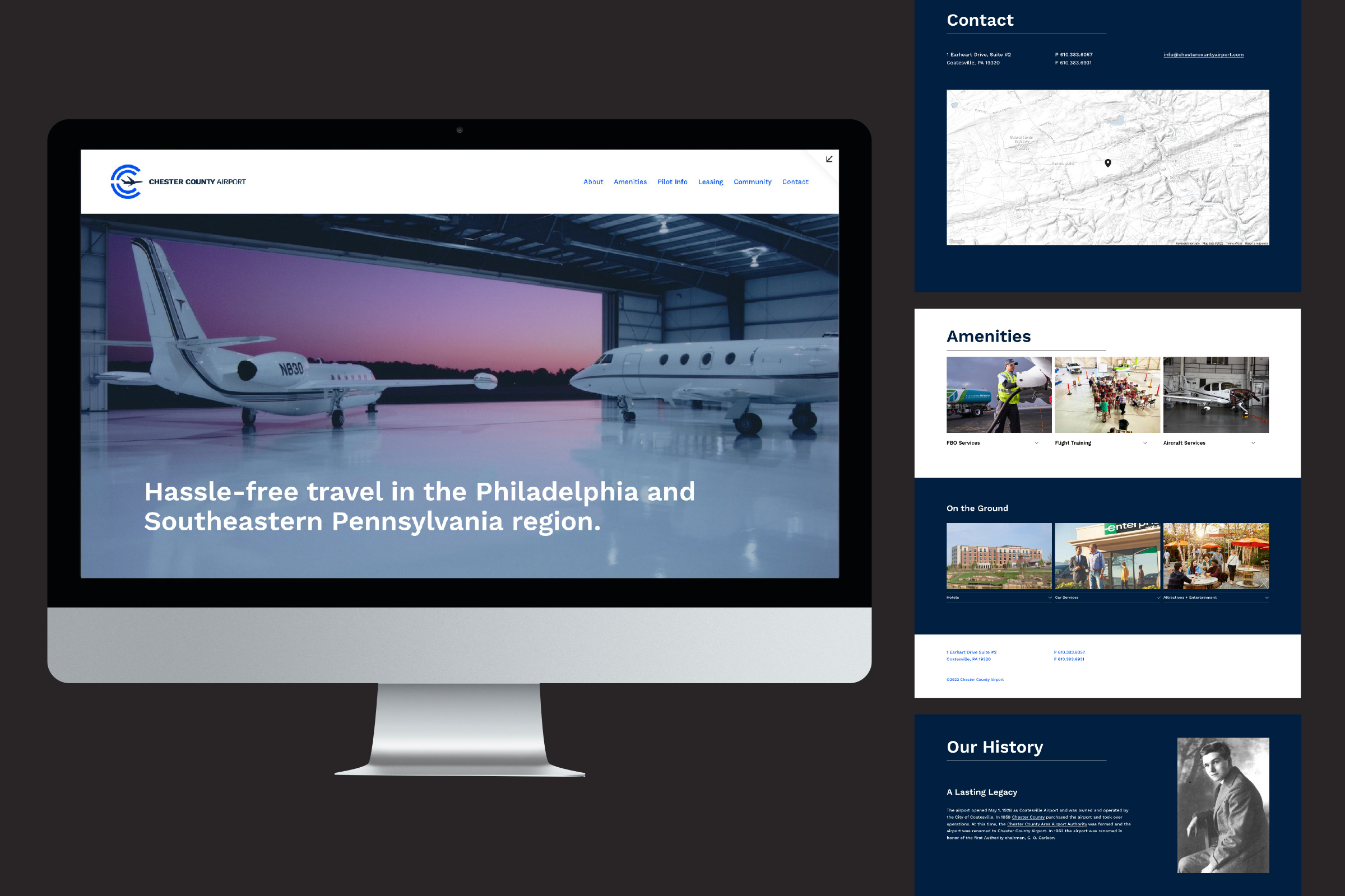 Situated in the bustling suburbs of Philadelphia, the Chester County Airport is surrounded by a wealth of businesses and attractions, making it an ideal hub for travel into and around Southeastern Pennsylvania. Avoiding the hassle of flying directly into the city, visitors enjoy a more relaxed and personalized service. In conjunction with imminent expansion projects, the Chester County Airport rebrand aims to create a deeper connection between the airport, its visitors, and the nearby community.