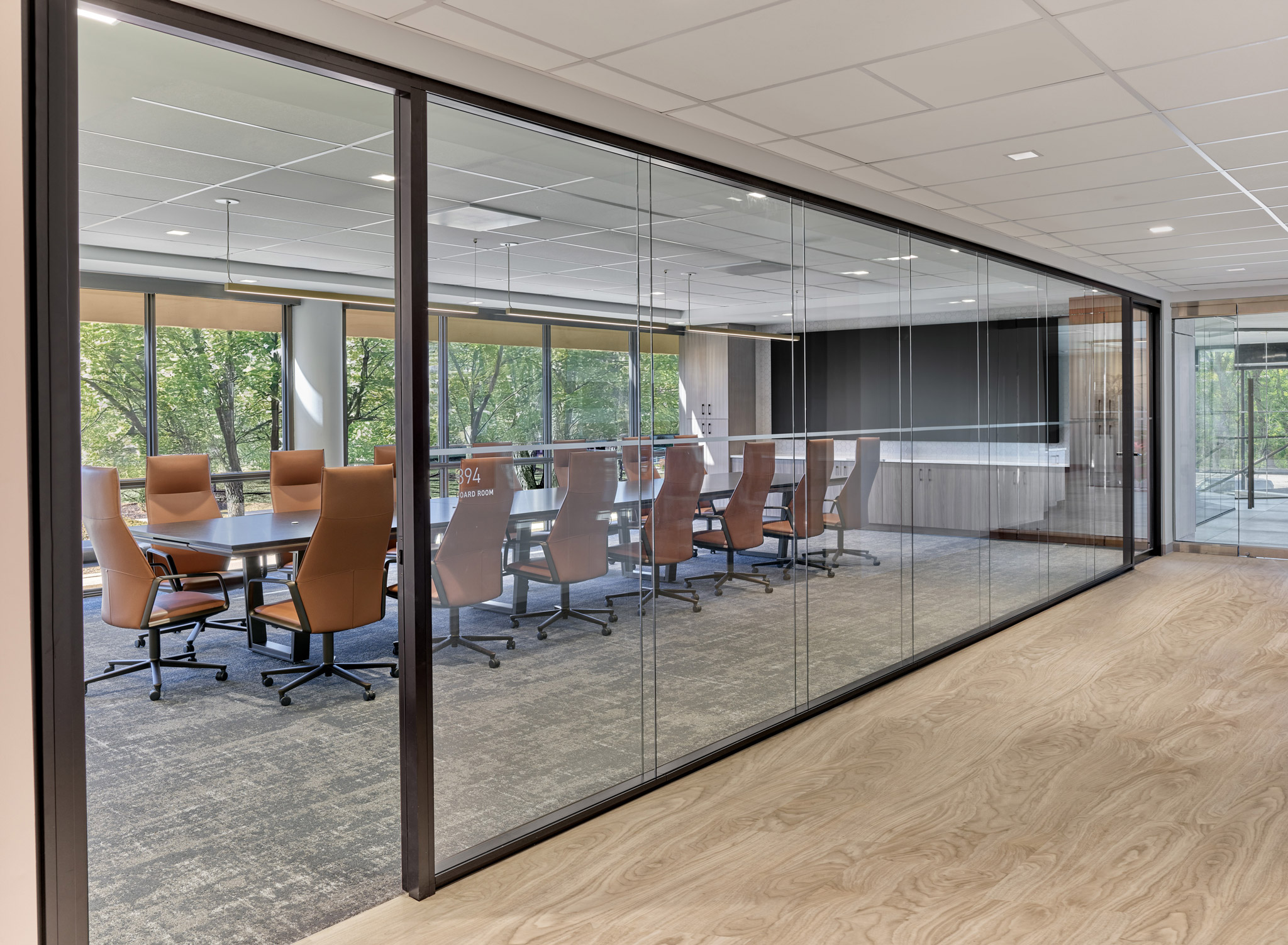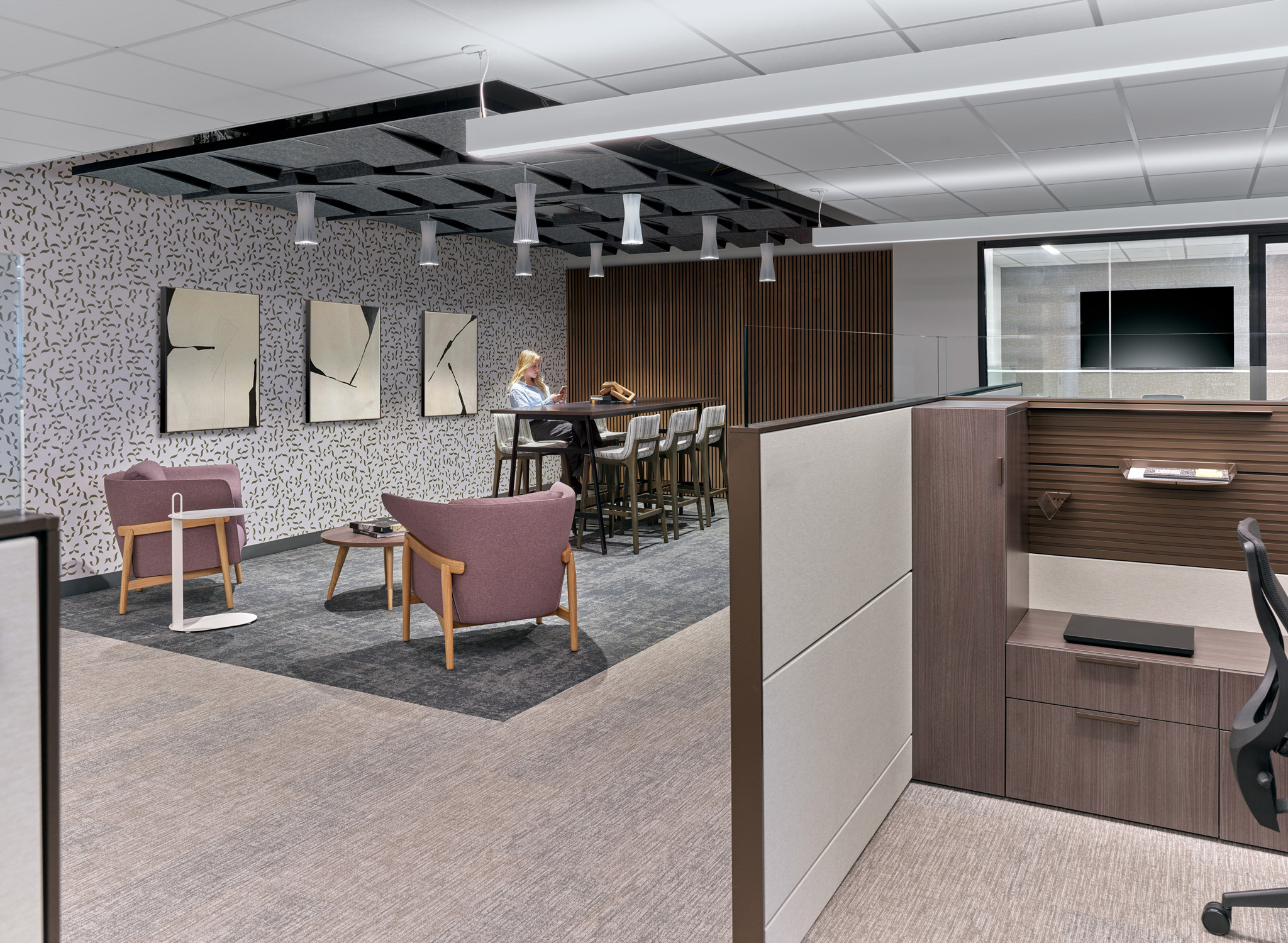Taking a practical approach, the renovation-in-place preserved much of the original layout while introducing key enhancements that foster collaboration, socialization, and transparency. The introduction of glass walls, updated lighting, and refreshed finishes create a brighter, more open environment, while new collaborative settings and gathering spaces support both formal meetings and casual interactions. A newly designed town hall space serves as a central hub for company-wide meetings, reinforcing connectivity and engagement.