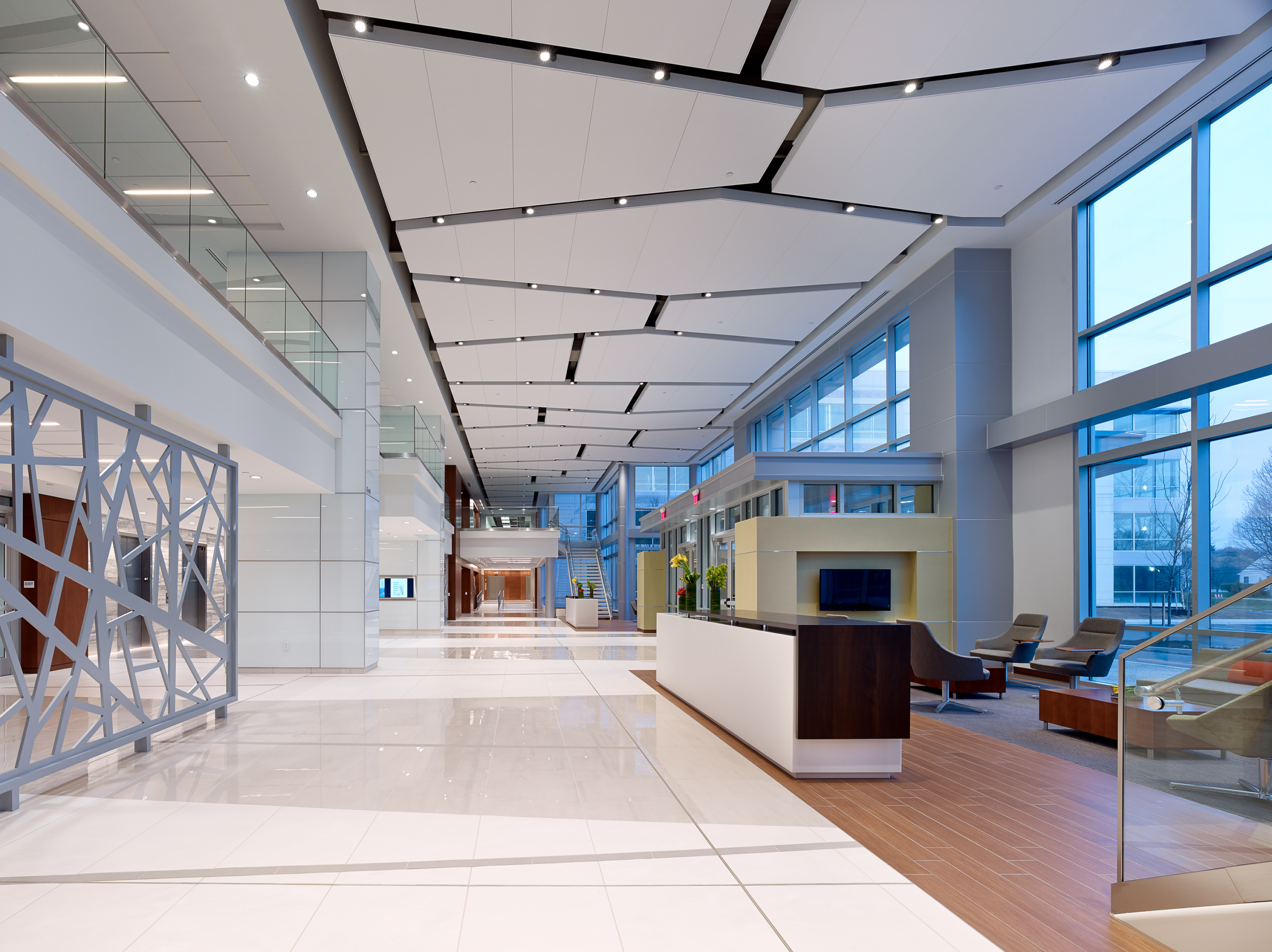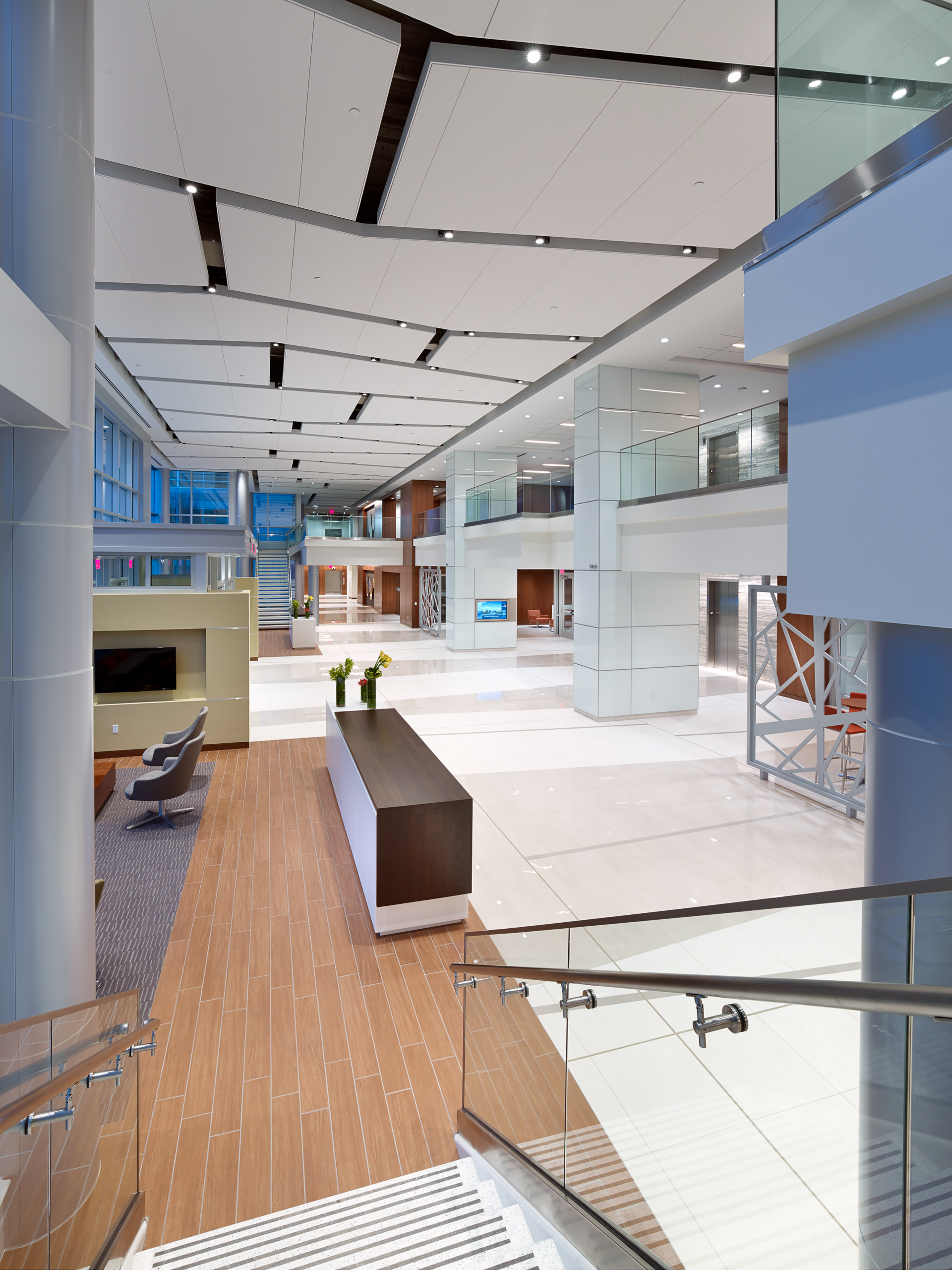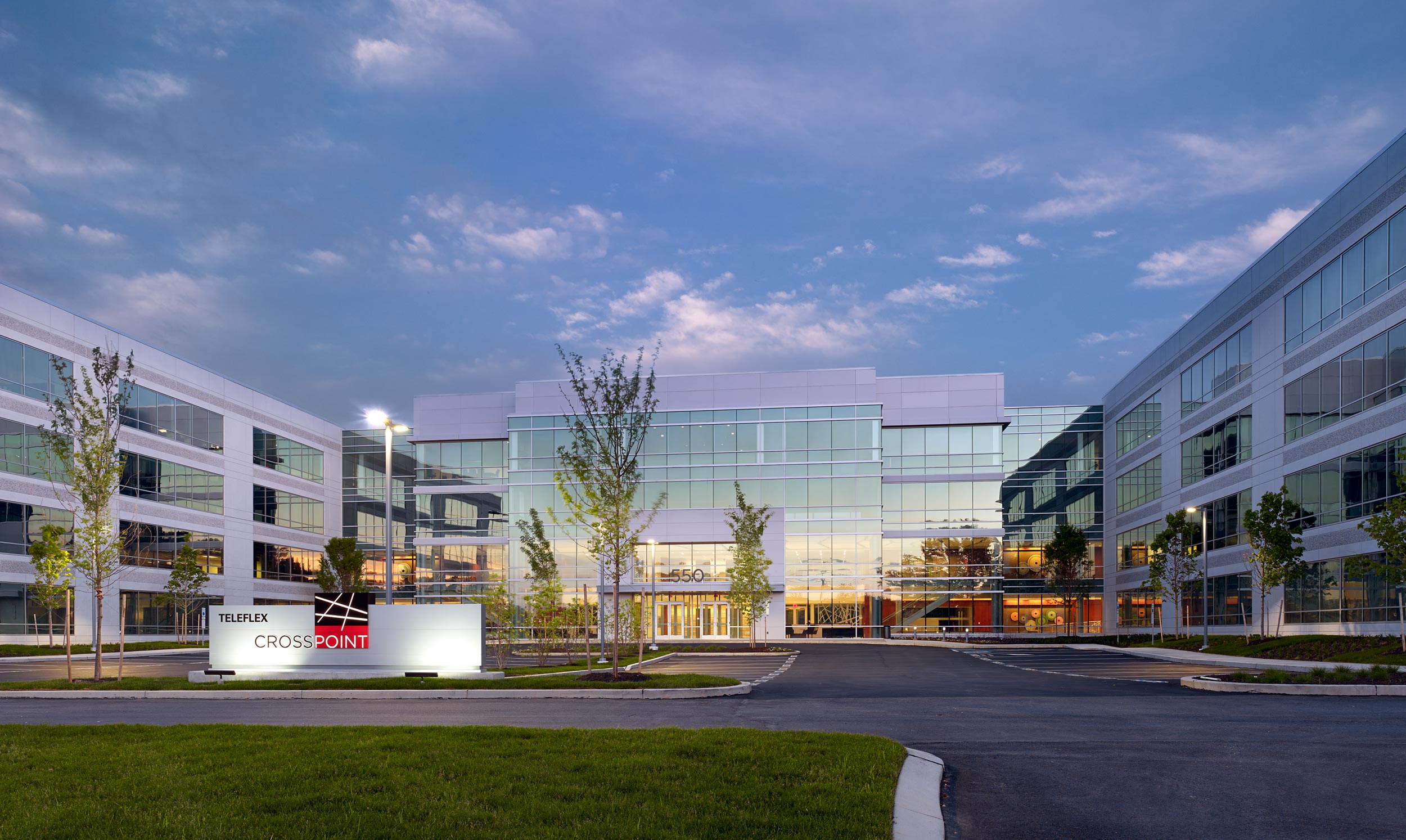 CrossPoint is all about blending—making two buildings into one; balancing work and life; mixing interior and exterior spaces. The 272,000 square foot design joins two previously standalone buildings with an interconnecting four-story addition of a two-story lobby and two floors of rentable office space. Building amenities help promote a healthy work/life blend and include a full-service cafeteria, fitness center, conferencing center, lobby coffee bar, and outdoor plaza space. D2 Branding also conceived a new wayfinding strategy inspired by the buildings’ new brand. Wayfinding and artistic elements give nod to the new logo and guide the user experience—from exterior monument and building signage to interactive digital information centers designed seamlessly into the interiors.