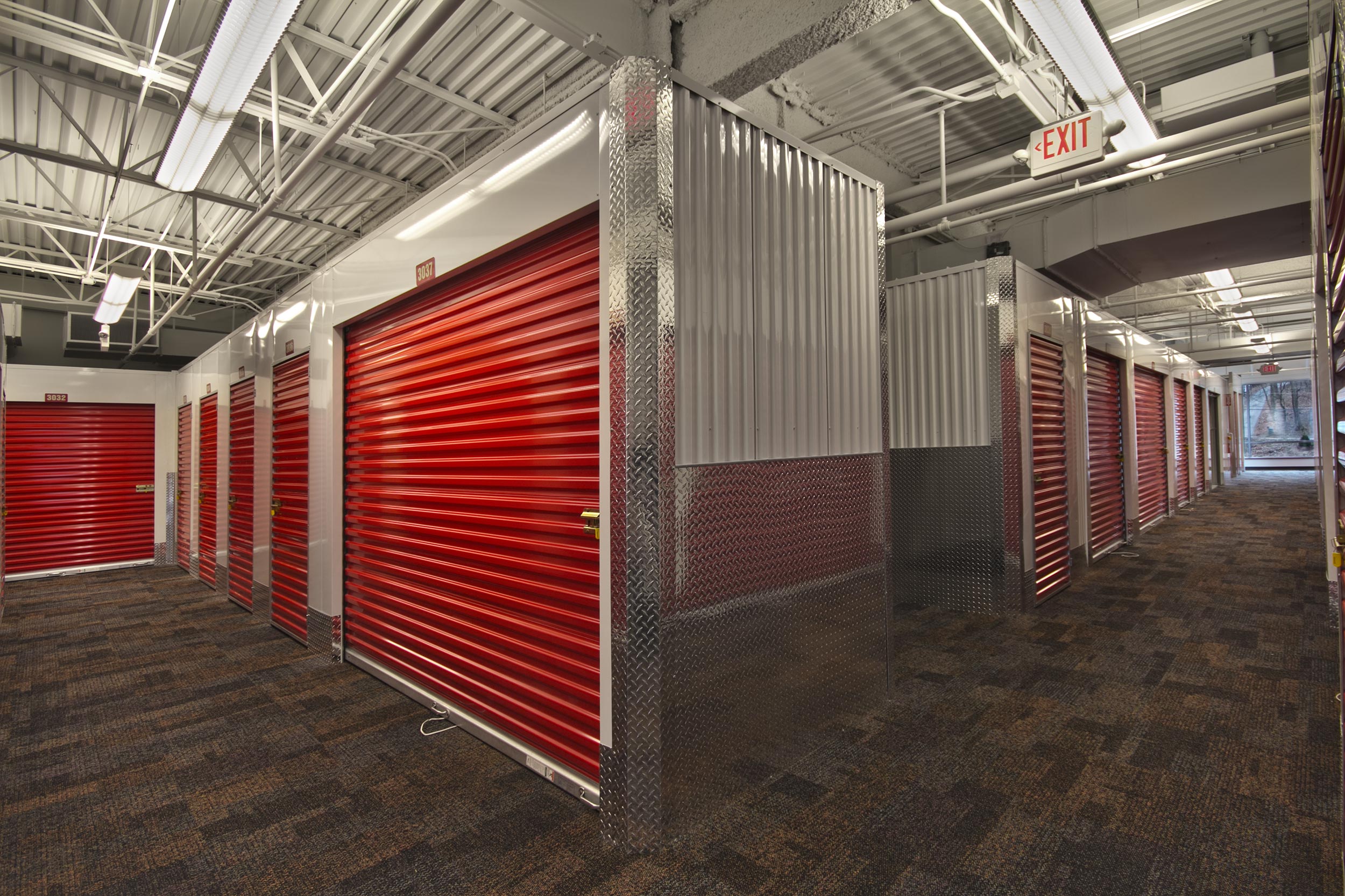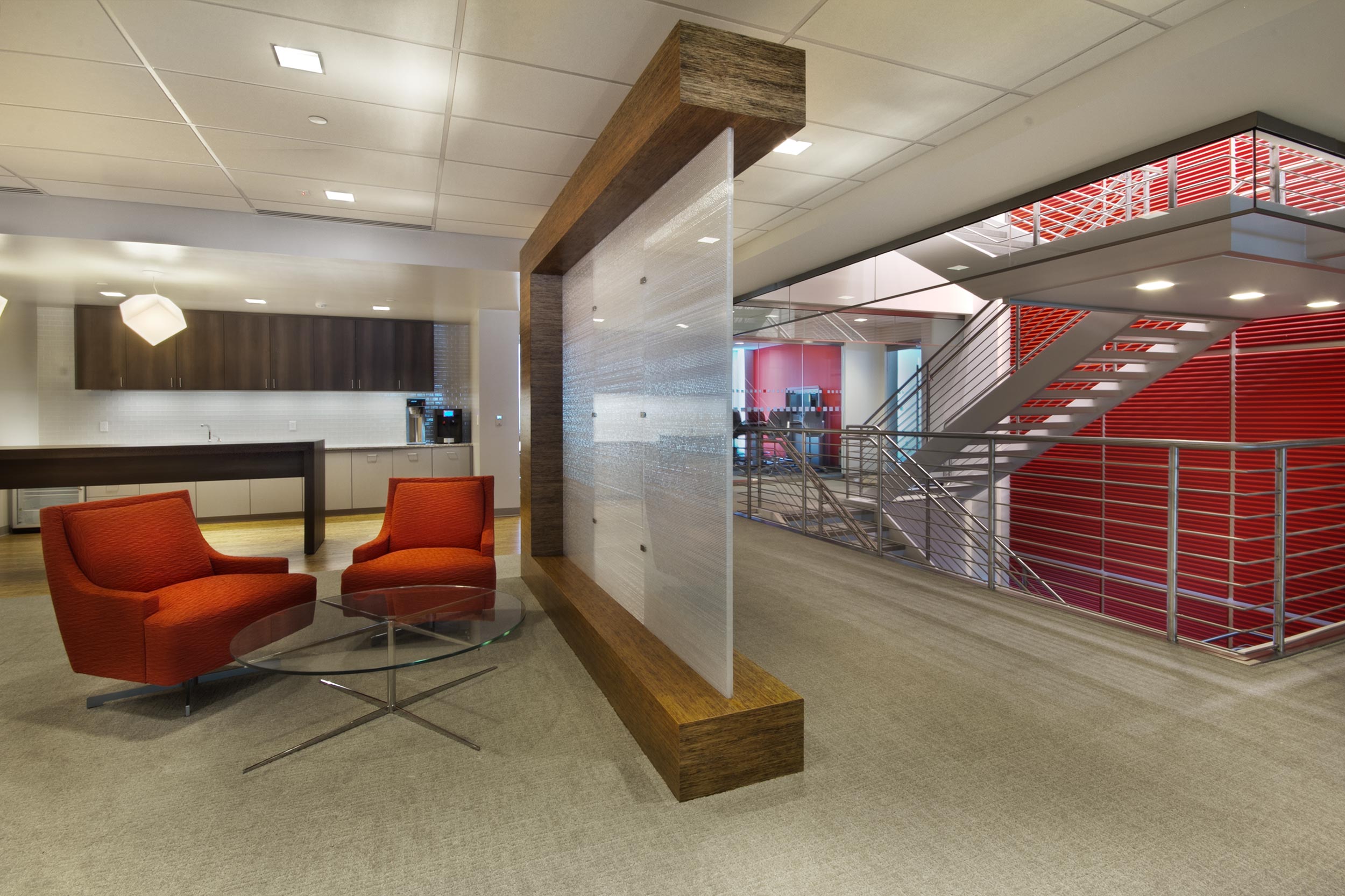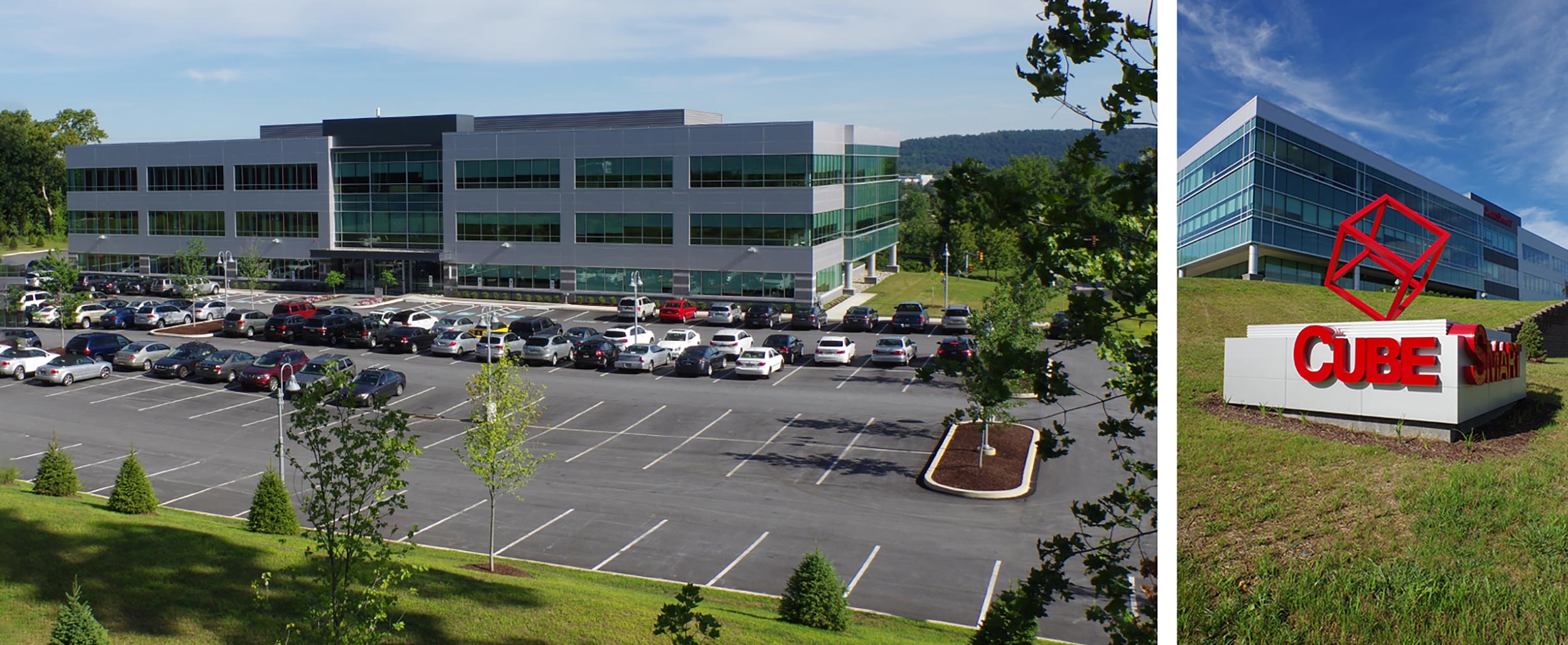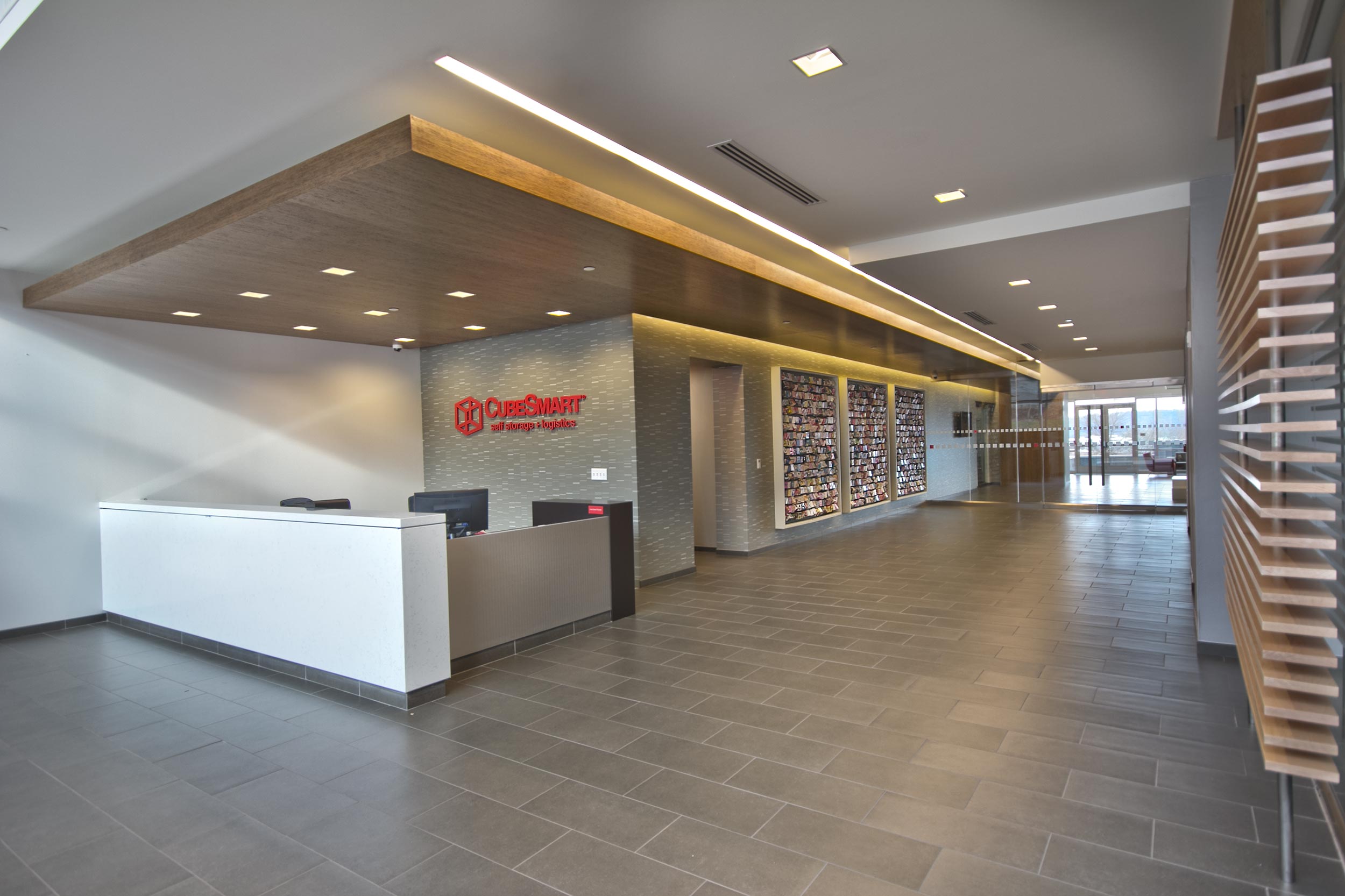 A certain duality gives the CubeSmart property in Malvern, PA a one of a kind look and feel. The 86,400 sq ft headquarters of the corporate self-storage chain is split—half office space, half a self-storage facility. D2 designed this build-to-suit headquarters to not only create a high-design destination for local and national employees, but also to showcase their product and service in a unique way. Half the building meets the complete needs of a corporate office space, and half meets all of the needs of a fully-equipped storage center open to the public, including a loading dock and freight elevator with greater weight capacity. One of the signature qualities of the building is the showcasing of the juxtaposition of office space to storage facility—from the road, you can see CubeSmart’s classic red-doored storage lockers on the right and glistening, modern office space on the left. Two very different spaces truly complement one another—in both design and function—to make CubeSmart headquarters a truly unique place to come to work.