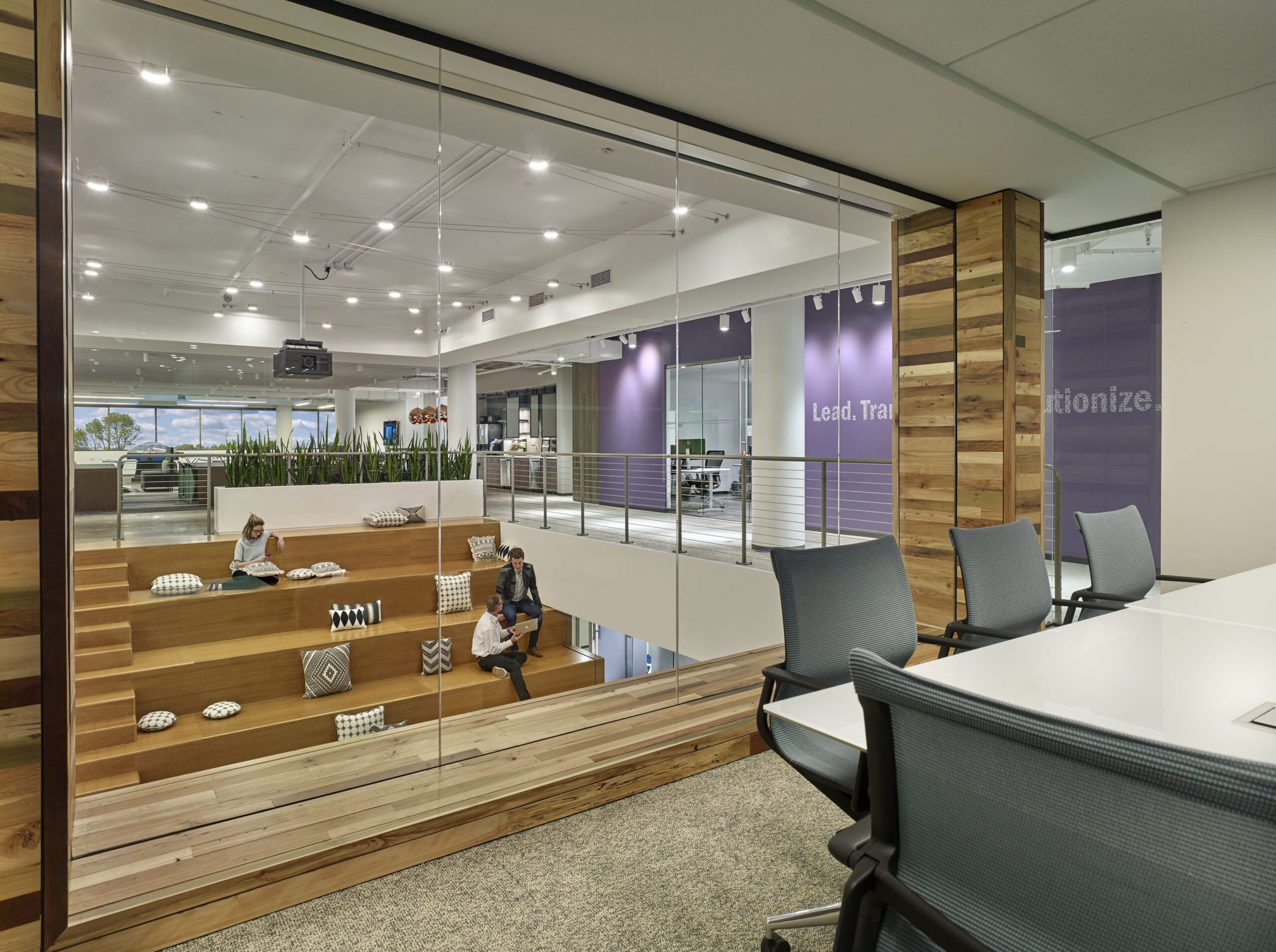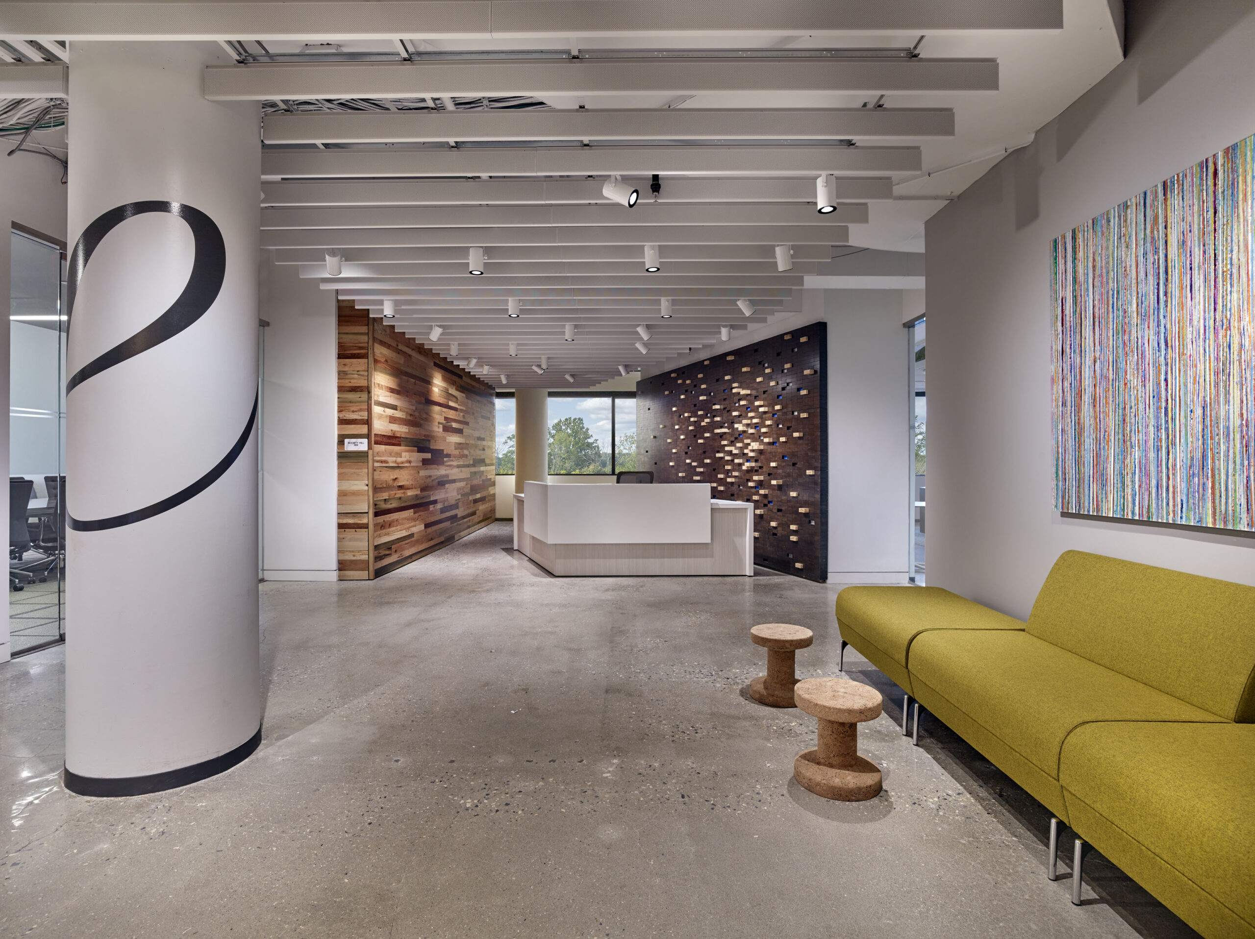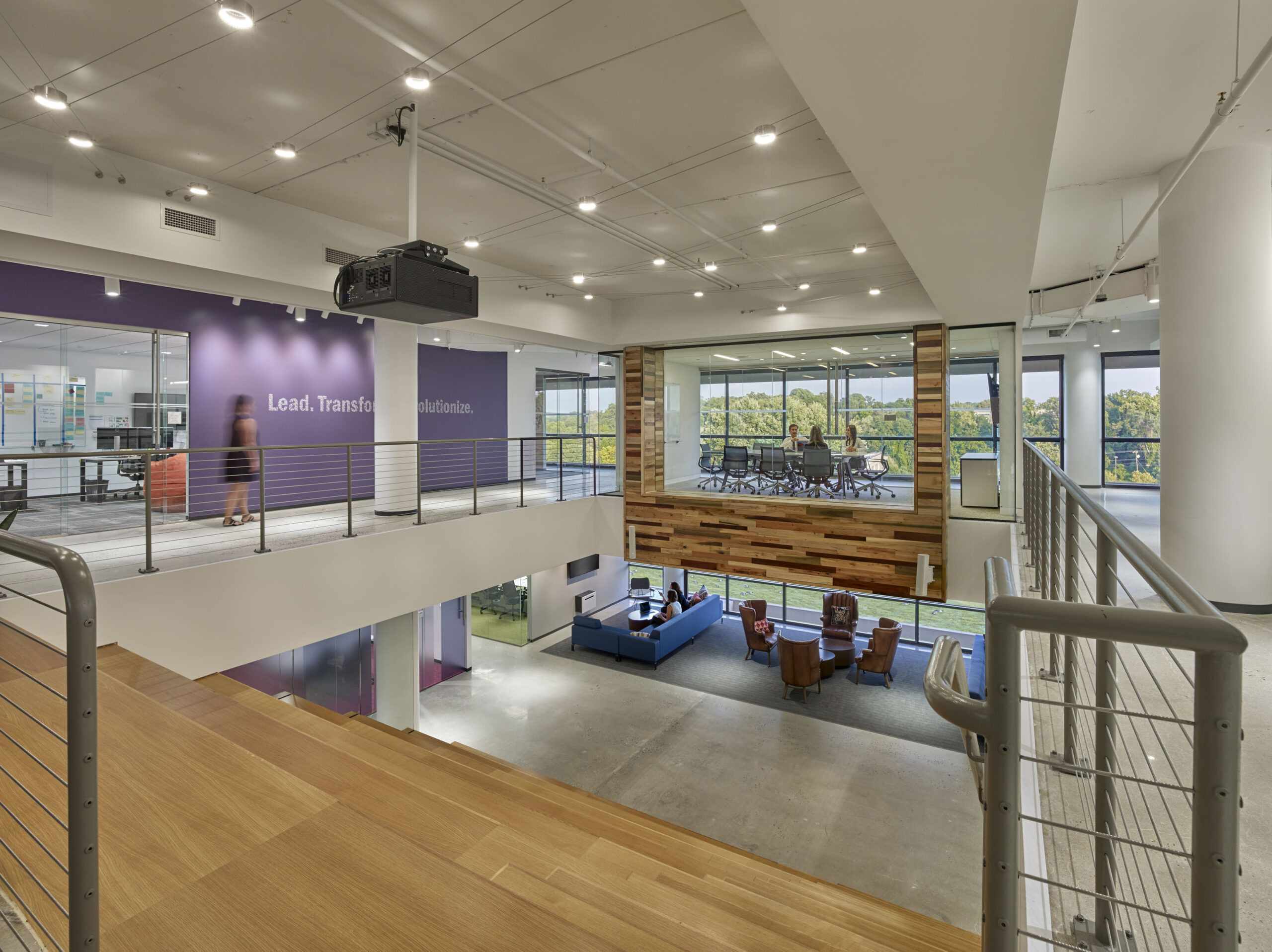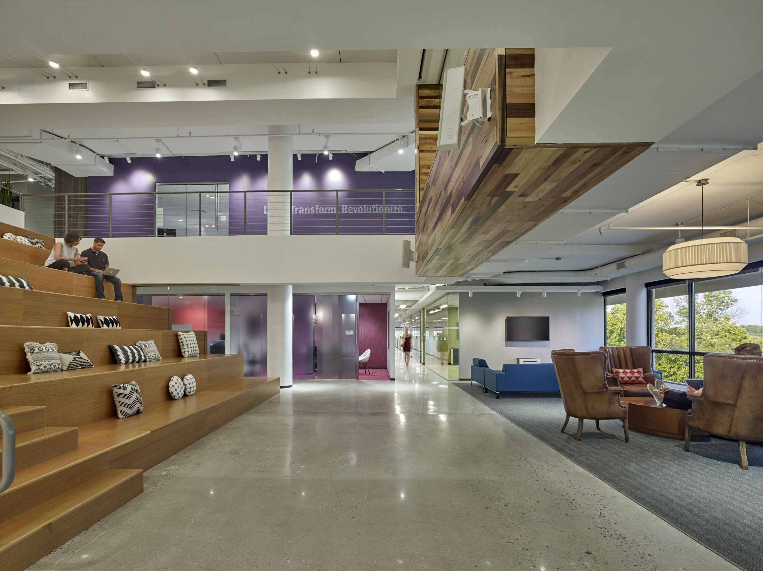 Recruiting top young talent is a persistent challenge for tech industries; D2 helped eMoney Advisors create a space that would help them do exactly that. Vibrant colors, raw finishes, and even a collaboration area designed like a garage—details throughout the space evoke vibes of a small start up. A central stair links the two main floors of the space and doubles as a large gathering hub for company-wide meetings. Work rooms, computer labs, private offices and open-office workstations offer a variety of work styles to accommodate any employee. It’s an office with small-space vibes for a big company.