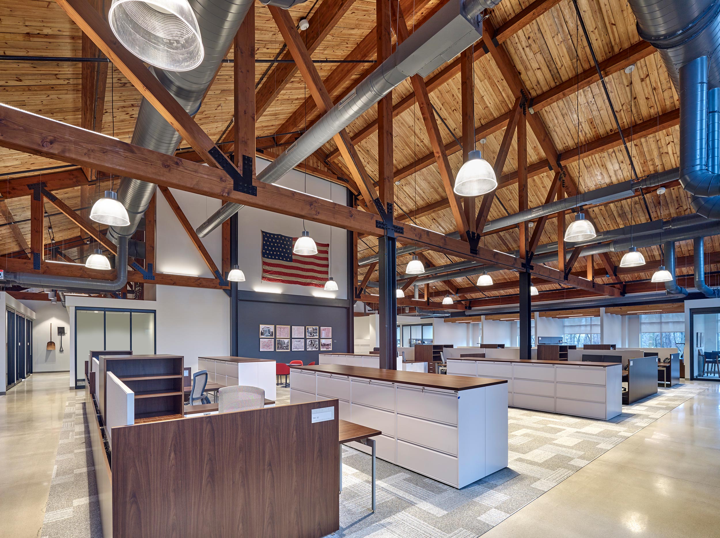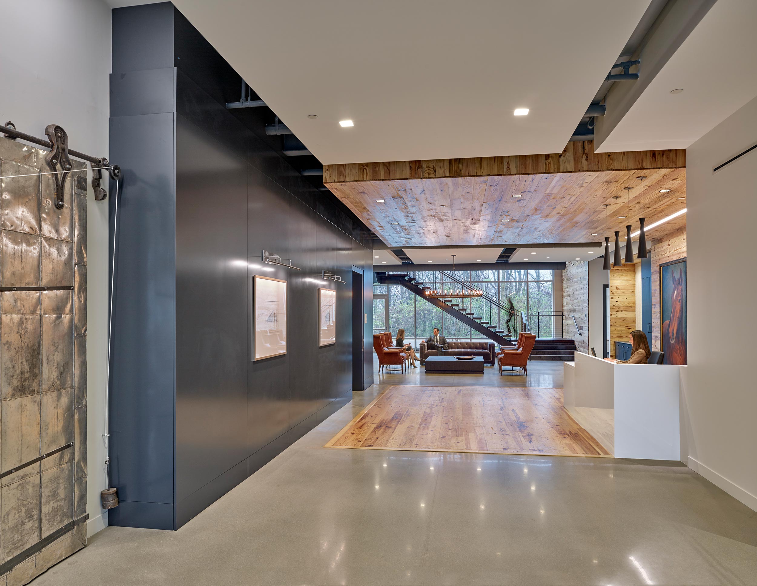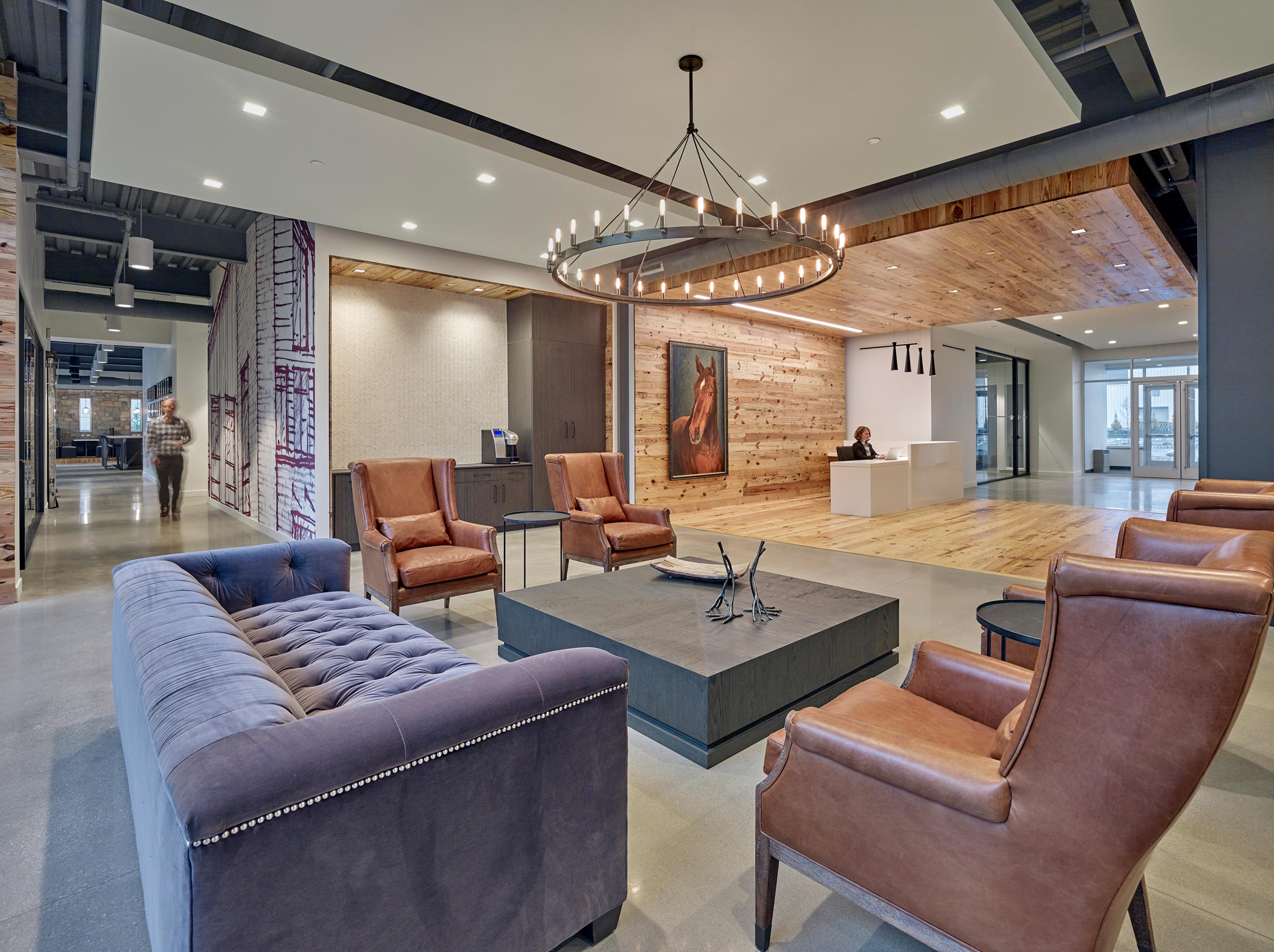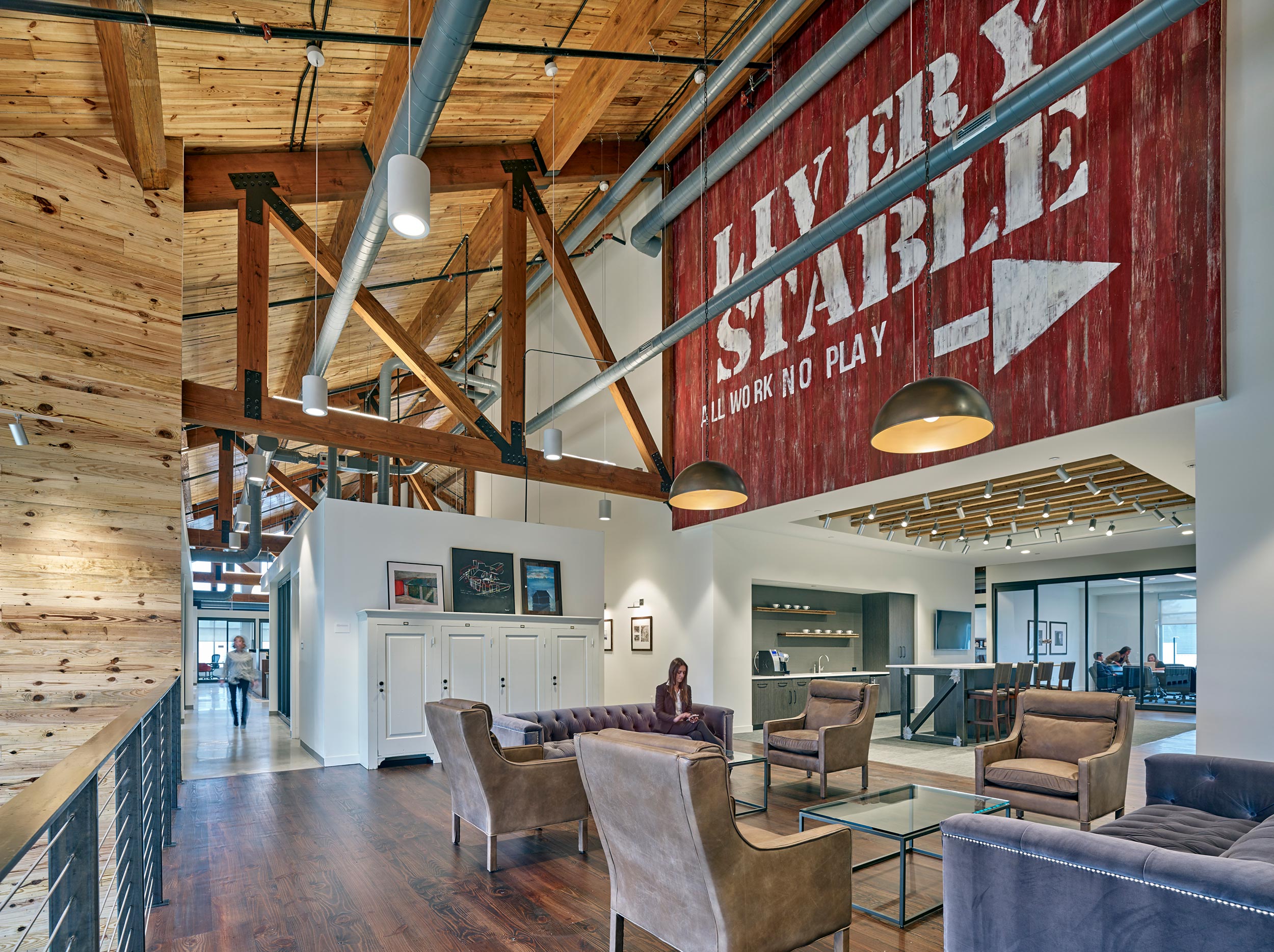 For the relocation of their headquarters to one of their signature development properties at Ellis Preserve, Equus tasked D2 to create their new home from the ground up. The HQ workspace has been referred to as a place for the ‘Gentleman Farmer’—blending a refined work environment with a warm, rustic atmosphere and taking inspiration from the history of the region as well as the spirit of the Equus brand. The building’s wood floors, vaulted ceilings, monumental stair, and casework as well as found object installations throughout are a result of hand-selected architectural salvage. These elements, along with a great emphasis on employee well-being, contributed to the buildings’ LEED Gold certification. Moving away from an aged and traditional office, the team embraced a new strategy that eliminated office walls and ceilings, uniting previously disparate teams. Designed to be social and inclusive, the studio environment and indoor/outdoor amenities truly bring everyone together.