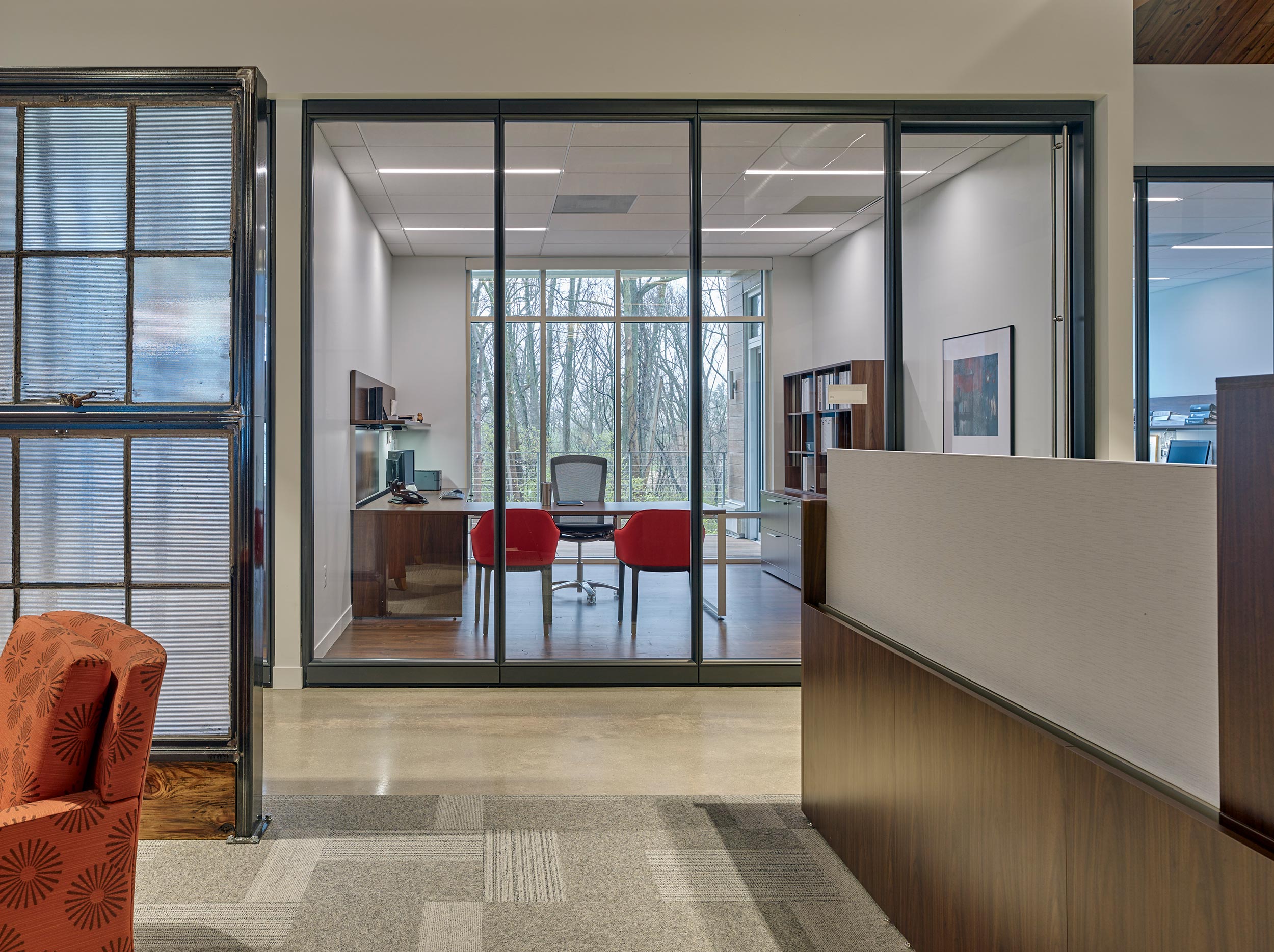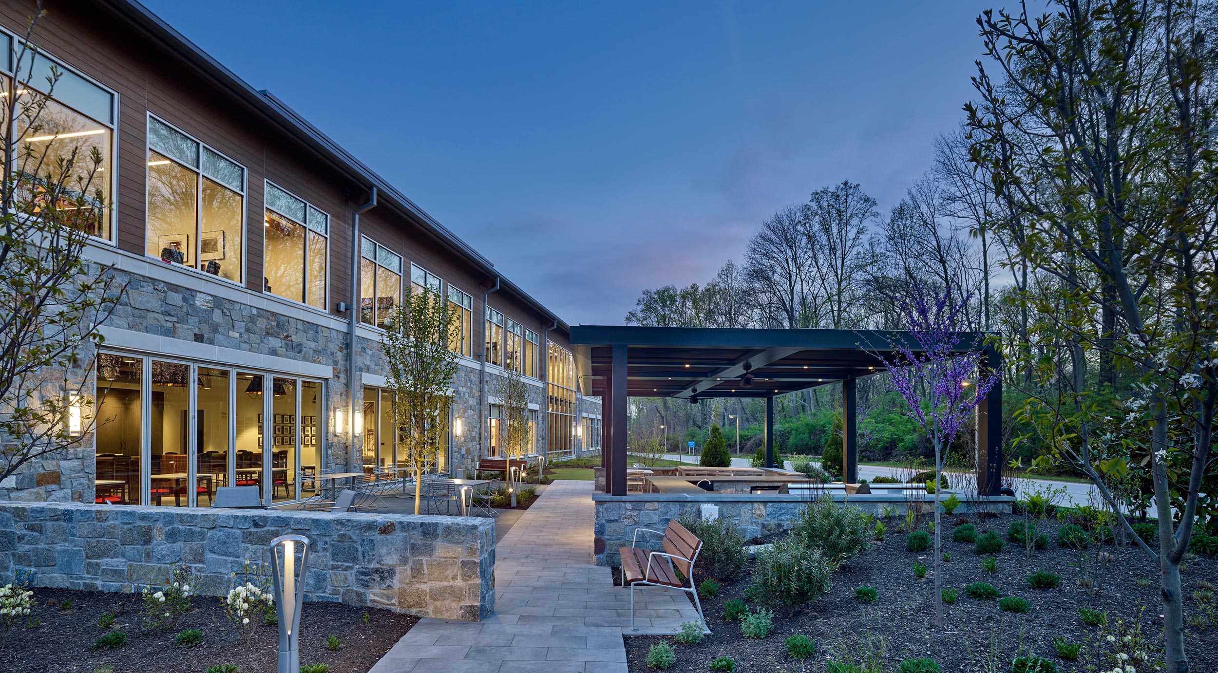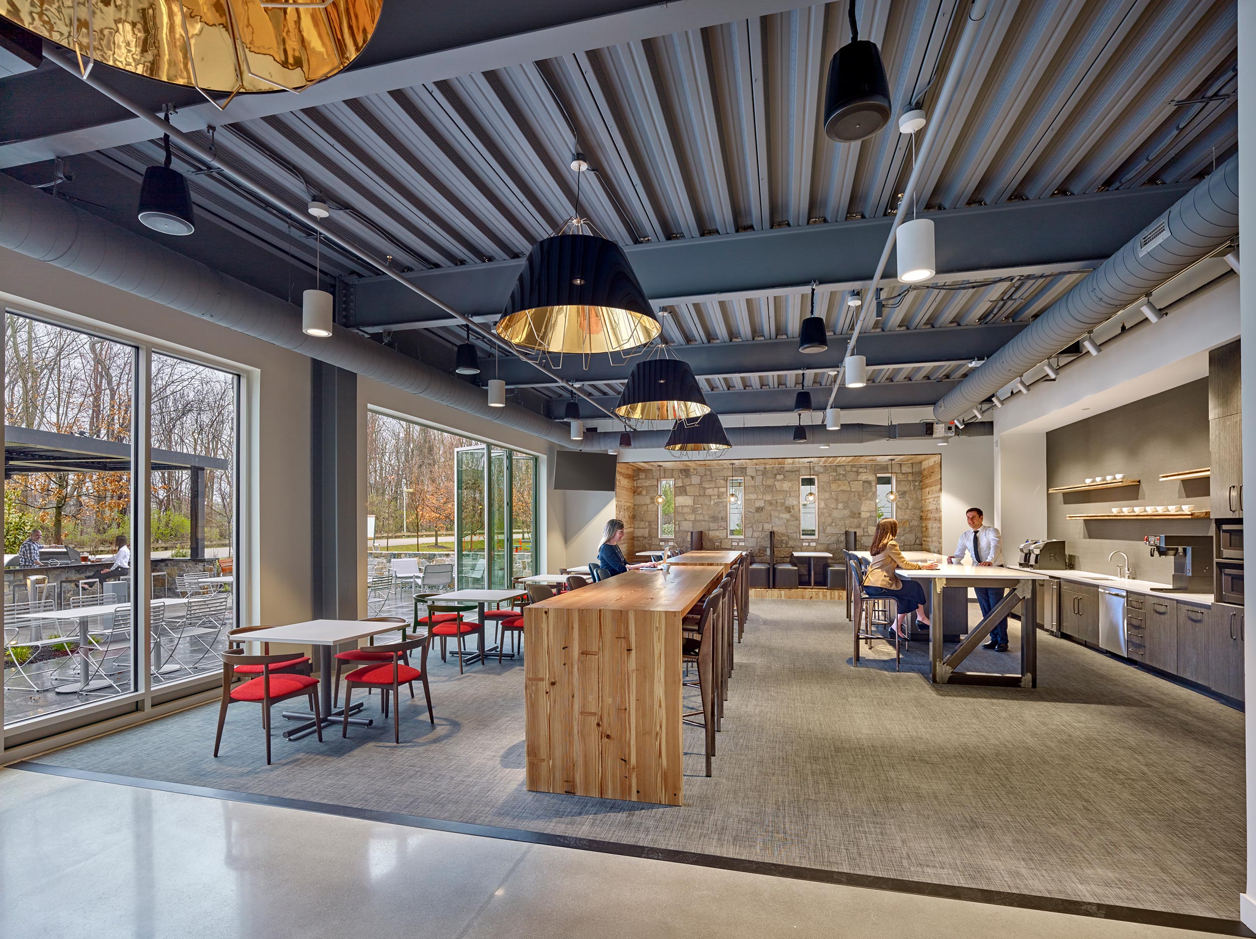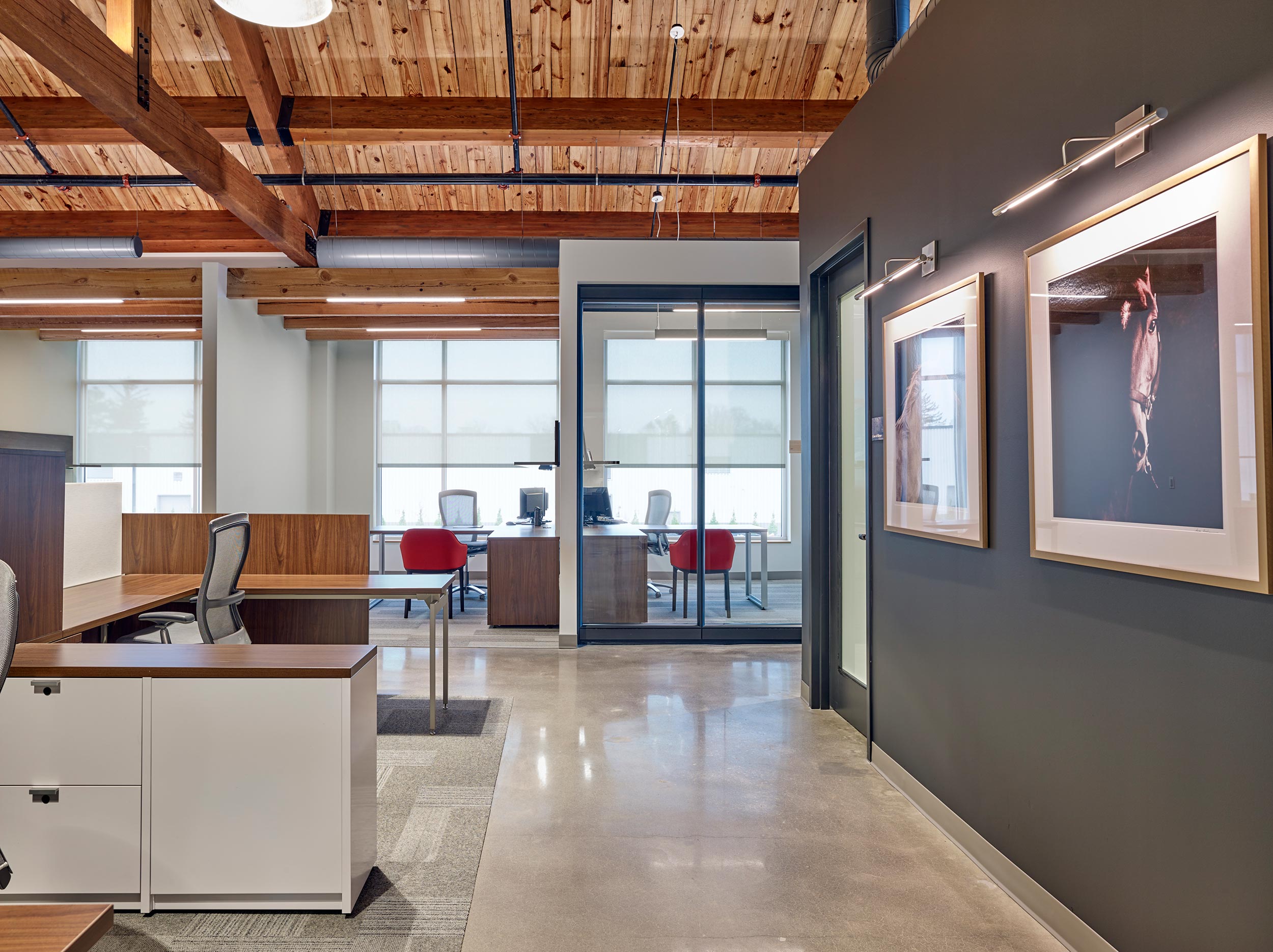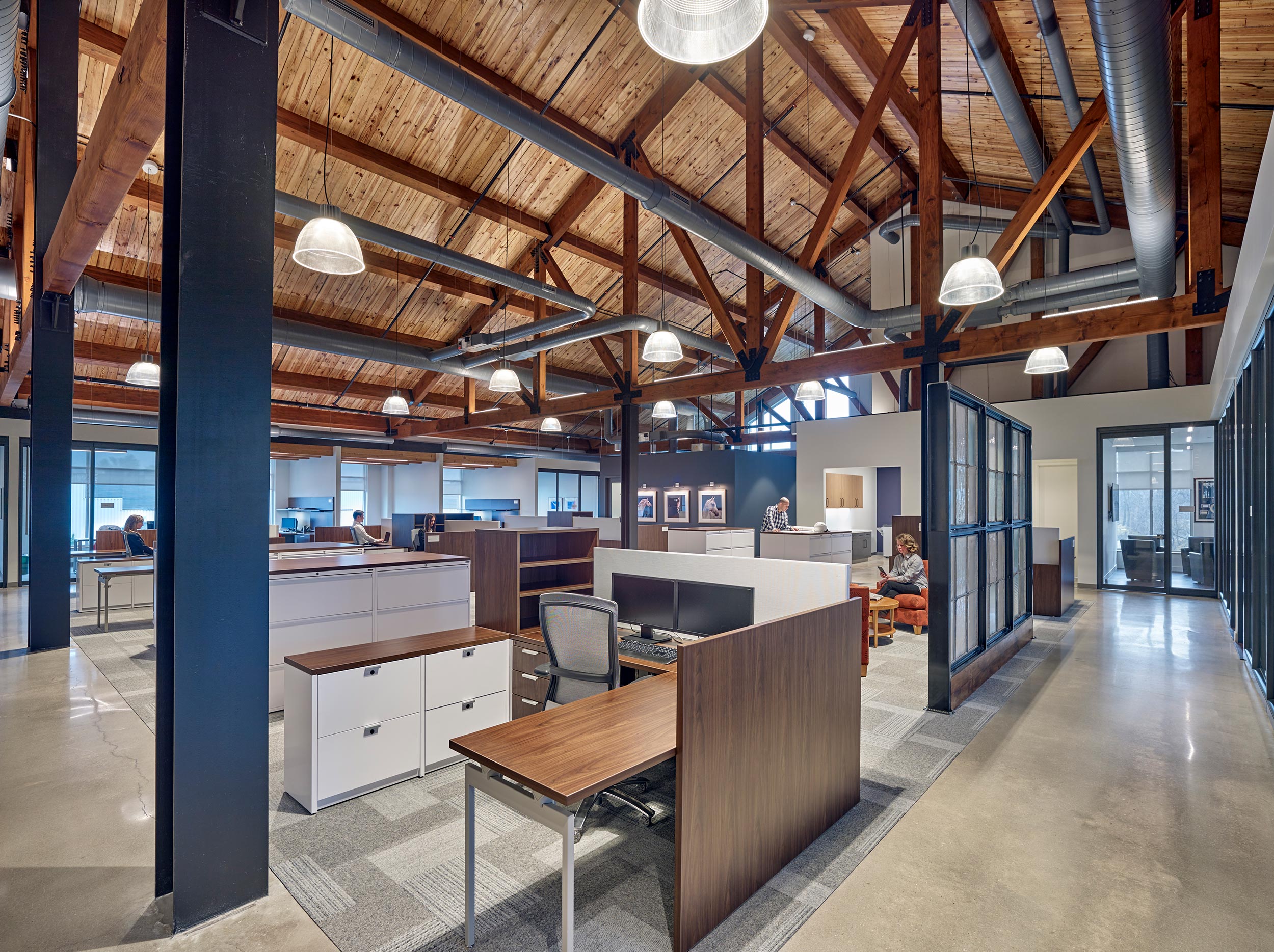 For the relocation of their headquarters to one of their signature development properties at Ellis Preserve, Equus tasked D2 to create their new home from the ground up. The HQ workspace has been referred to as a place for the ‘Gentleman Farmer’—blending a refined work environment with a warm, rustic atmosphere and taking inspiration from the history of the region as well as the spirit of the Equus brand. The building’s wood floors, vaulted ceilings, monumental stair, and casework as well as found object installations throughout are a result of hand-selected architectural salvage. These elements, along with a great emphasis on employee well-being, contributed to the buildings’ LEED Gold certification. Moving away from an aged and traditional office, the team embraced a new strategy that eliminated office walls and ceilings, uniting previously disparate teams. Designed to be social and inclusive, the studio environment and indoor/outdoor amenities truly bring everyone together.