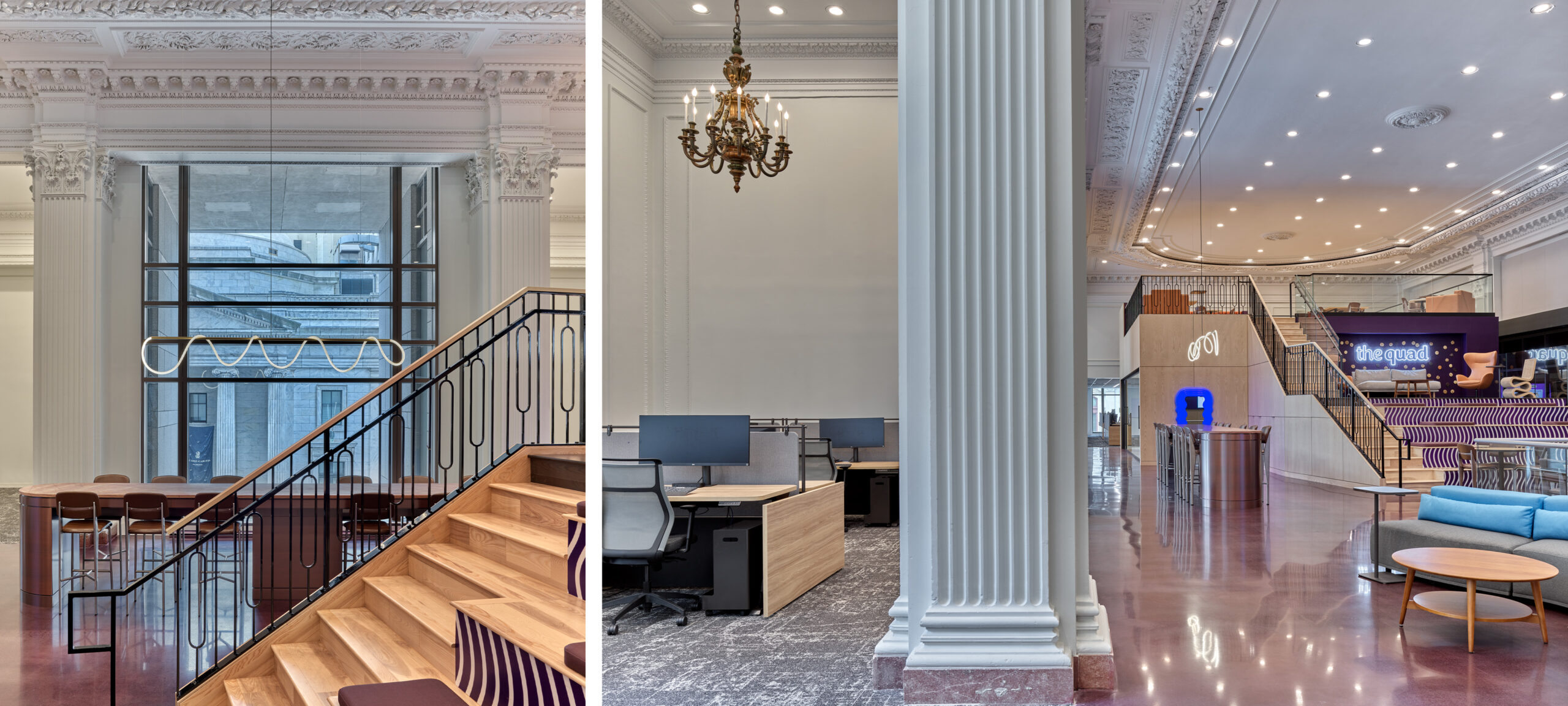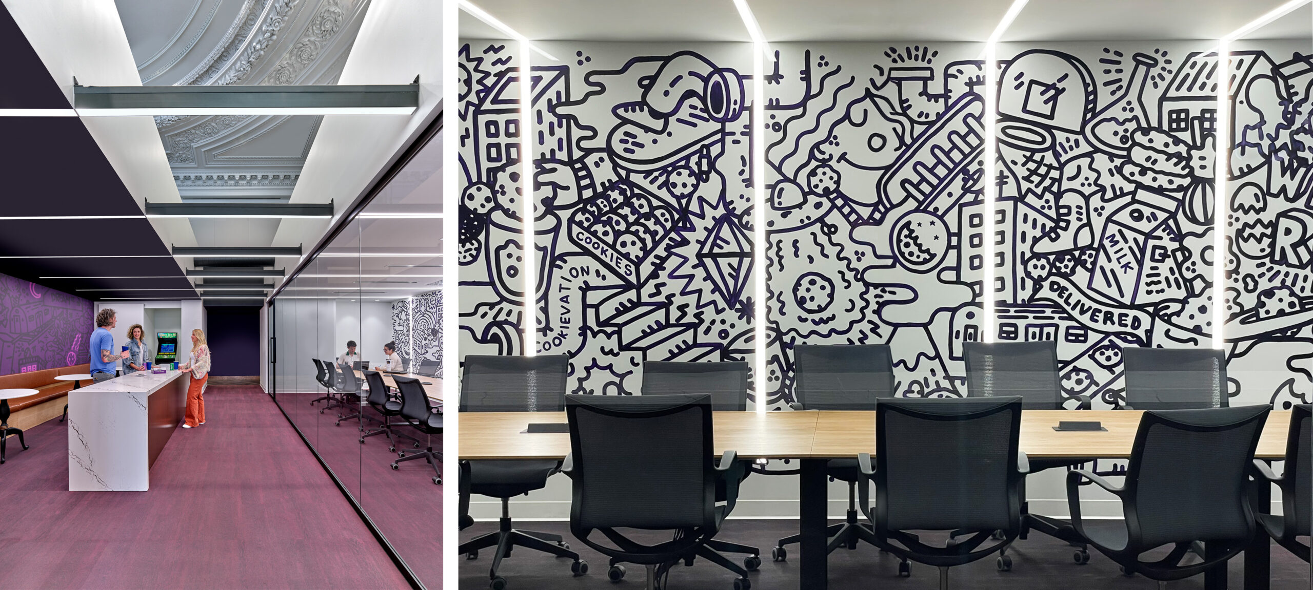 Within William Penn’s eyesight, perched atop City Hall, glow the neon lights within Insomnia Cookies Headquarters in the heart of Downtown Philadelphia. This cheeky juxtaposition of history and à la mode culture sets the stage for an unforgettable fusion of classic architecture and daring design.