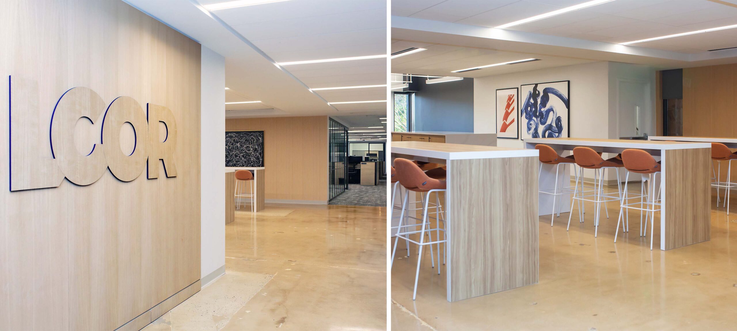 The workplace is highly adaptable with infrastructure pre-planned for flexibility and furniture layouts adaptable to organic growth – allowing LCOR the ability to evolve and pivot quickly. Maximum transparency further increases connectivity and collaboration and connects interior spaces to the natural light and gardens just outside. The understated, upscale design is complimented by integral branding and an artwork program that is residential inspired. The result is an office with an easy, welcomingly warm vibe that is future ready.
