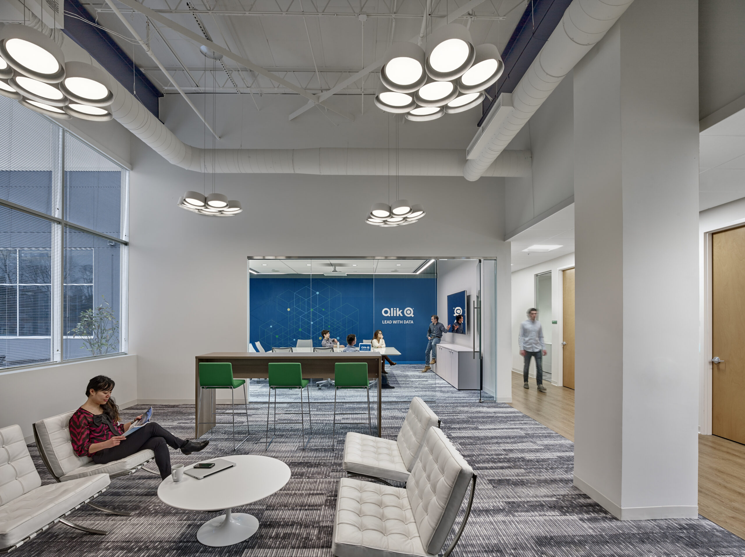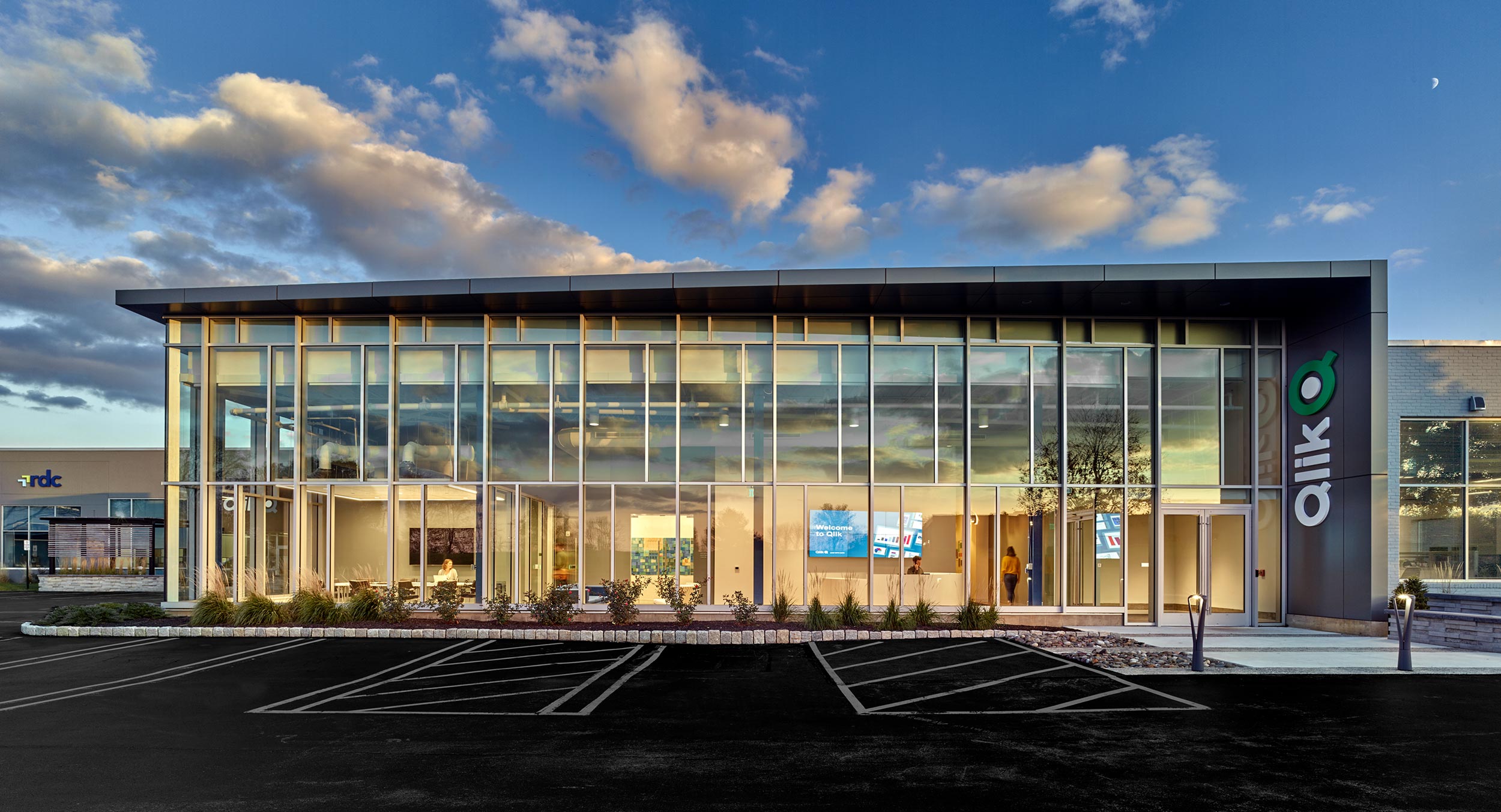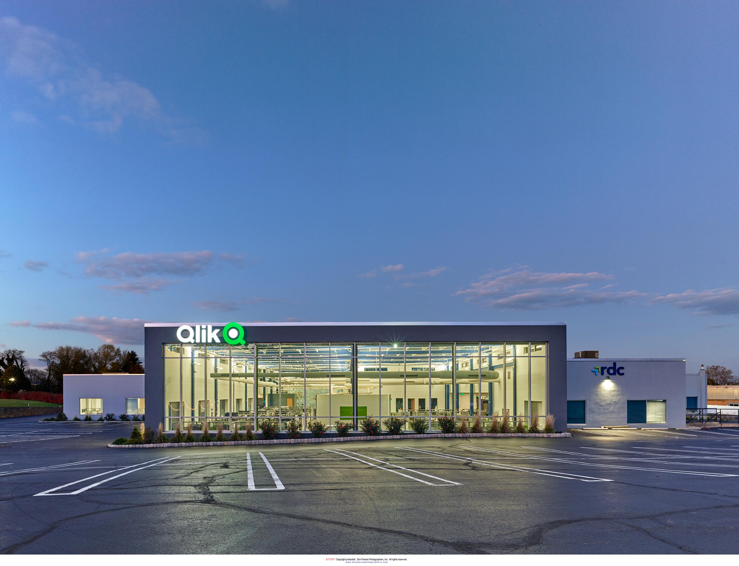Qlik was losing energy in their suburban Philadelphia space—departments were transferring to other office locations and employees were increasingly working from home. Their relocation provided the opportunity to drastically affect their company’s structure, moving from an office heavy footprint to an open floor plan. It also provided the opportunity to minimize real estate costs by maintaining most of the existing conditions. Renovations were strategically controlled and applied where impact would be greatest – reception area and meeting spaces– while the overall design strategy focused on infusing the Qlik brand and personality. The exterior of the building was reclad to include storefront glass and bold branding.