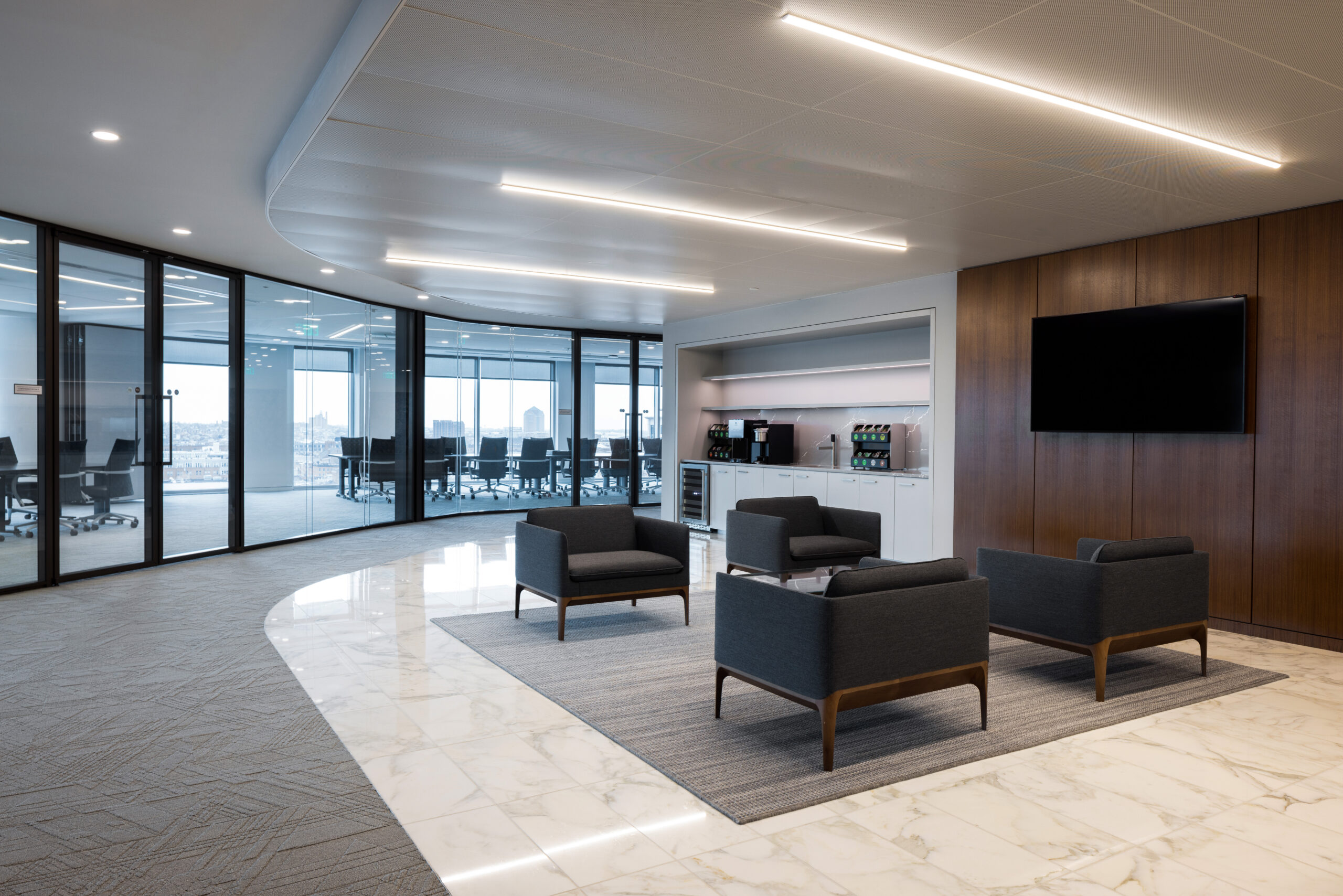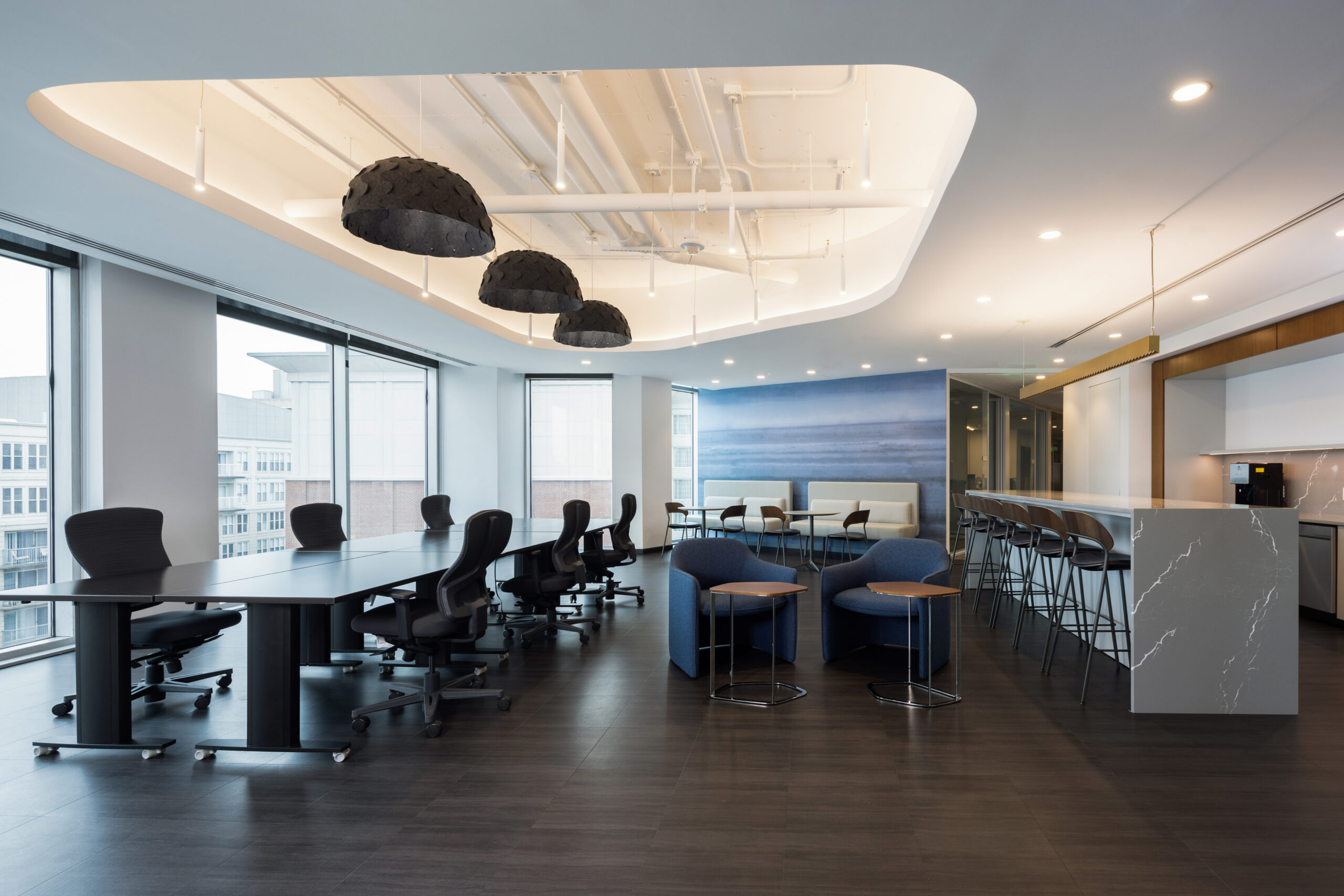 D2’s national partnership with Saul Ewing was initiated with the development of national design standards. Since, the firm has begun rolling them out across their portfolio. Spatial standards and level of fit and finish are a constant while each location is unique in culture, operations and aesthetic style. In Baltimore, the team was ready to push their workplace beyond the long-established traditional strategy of law firms. Their drivers – mentorship, socialization, and increased connectivity through transparency – led to the development of additional space types to support the hybrid workforce. Multi-purpose areas are strategically located – bringing junior associates, senior partners, remote first attorneys, and legal teams together. Unassigned settings were given prime corner real estate and include a mix of open, closed, and casual seats with adjacent coffee bar and meeting spaces. The heart of the workplace is a mixed-use gathering area with outdoor access that can be used to host events, individual work, and meaningful collaborative connections. The legal office is one that is rapidly evolving and the Baltimore location takes Saul Ewing into the future.