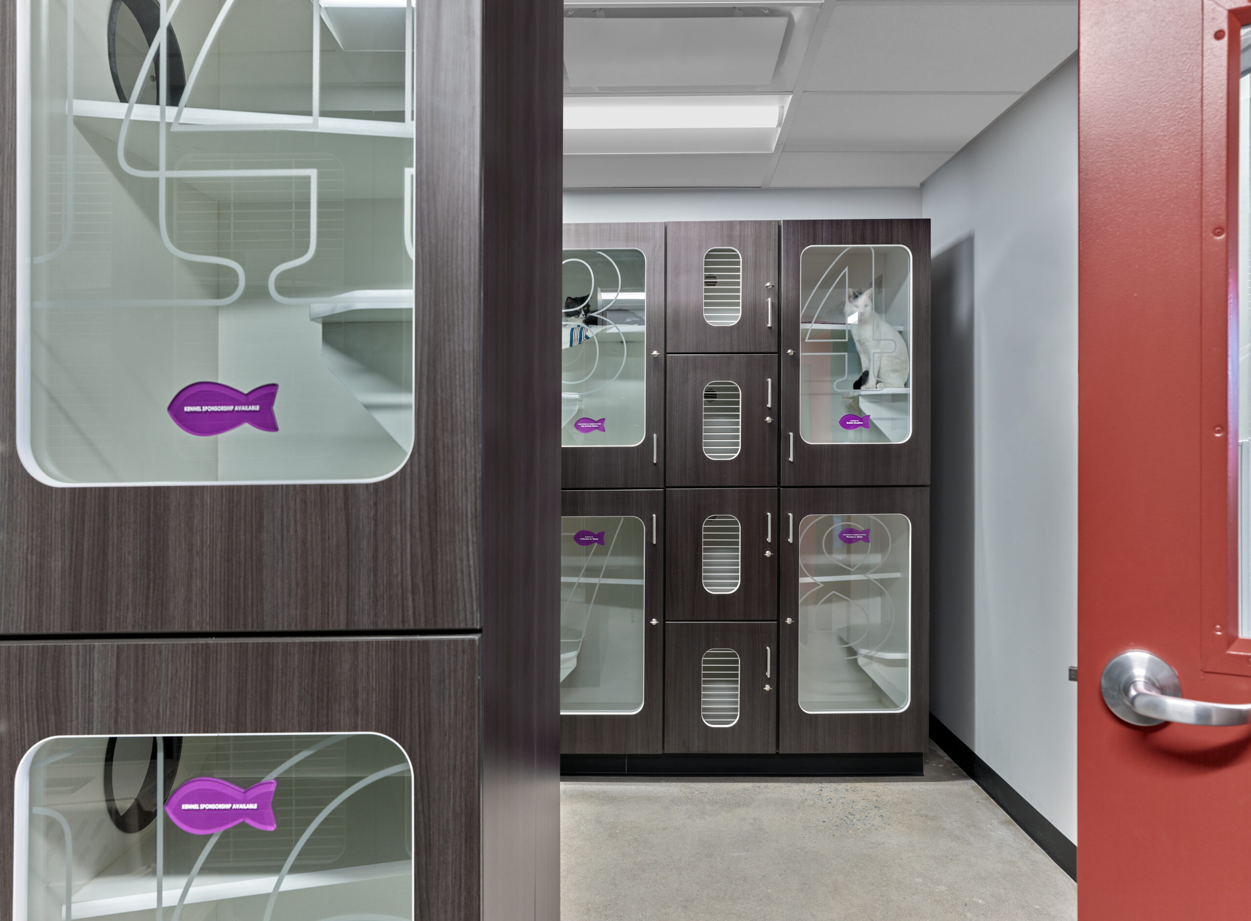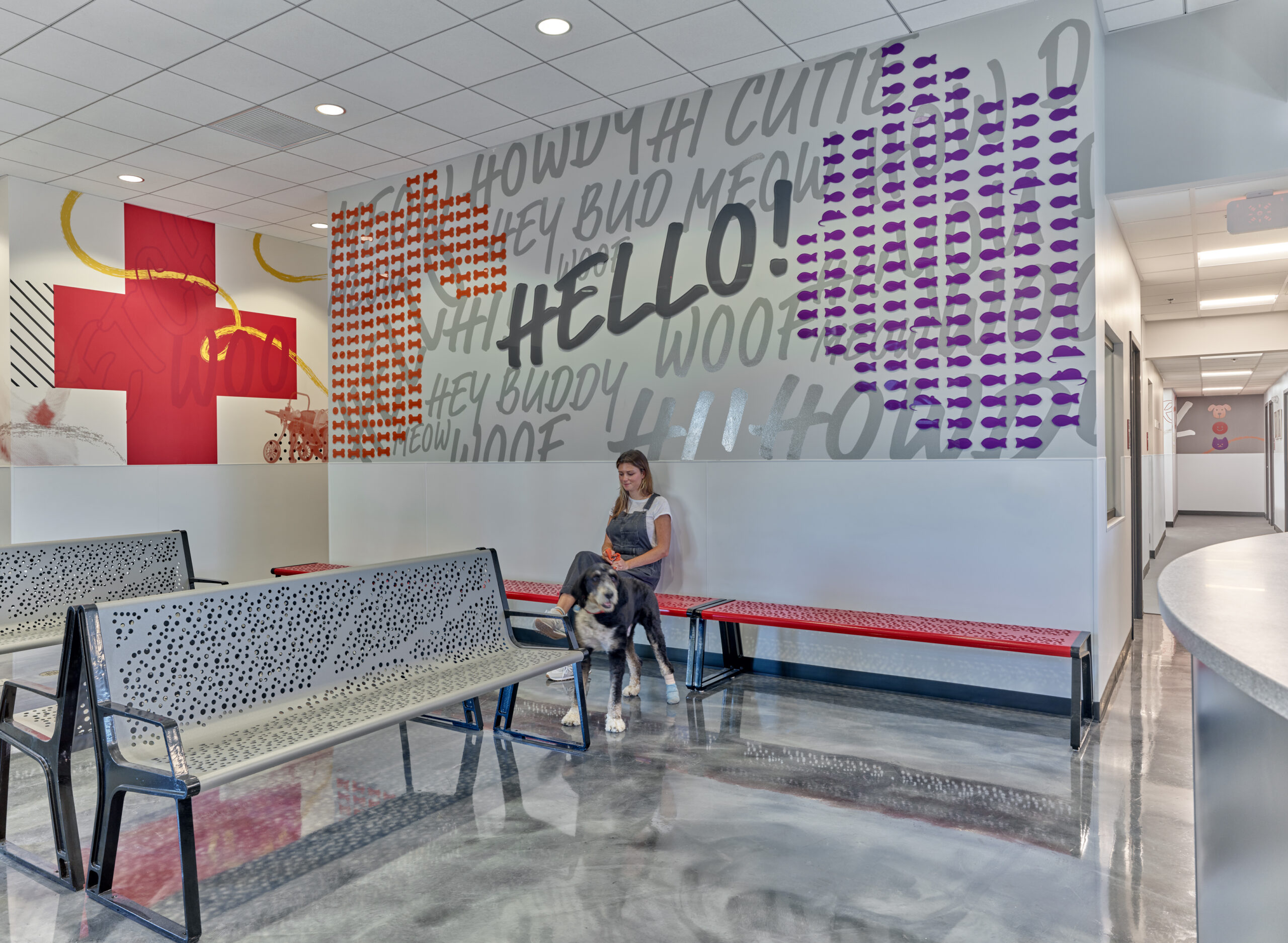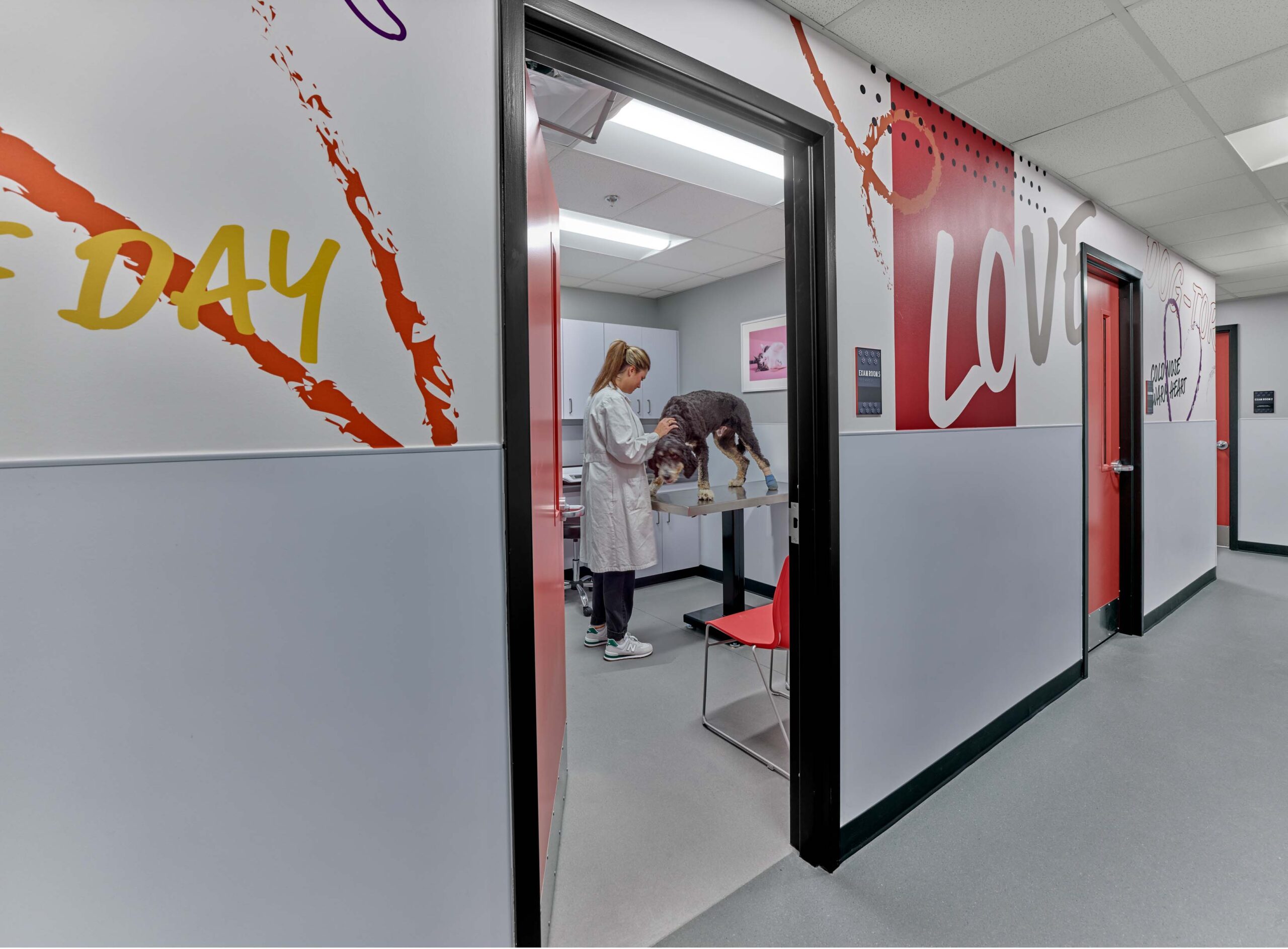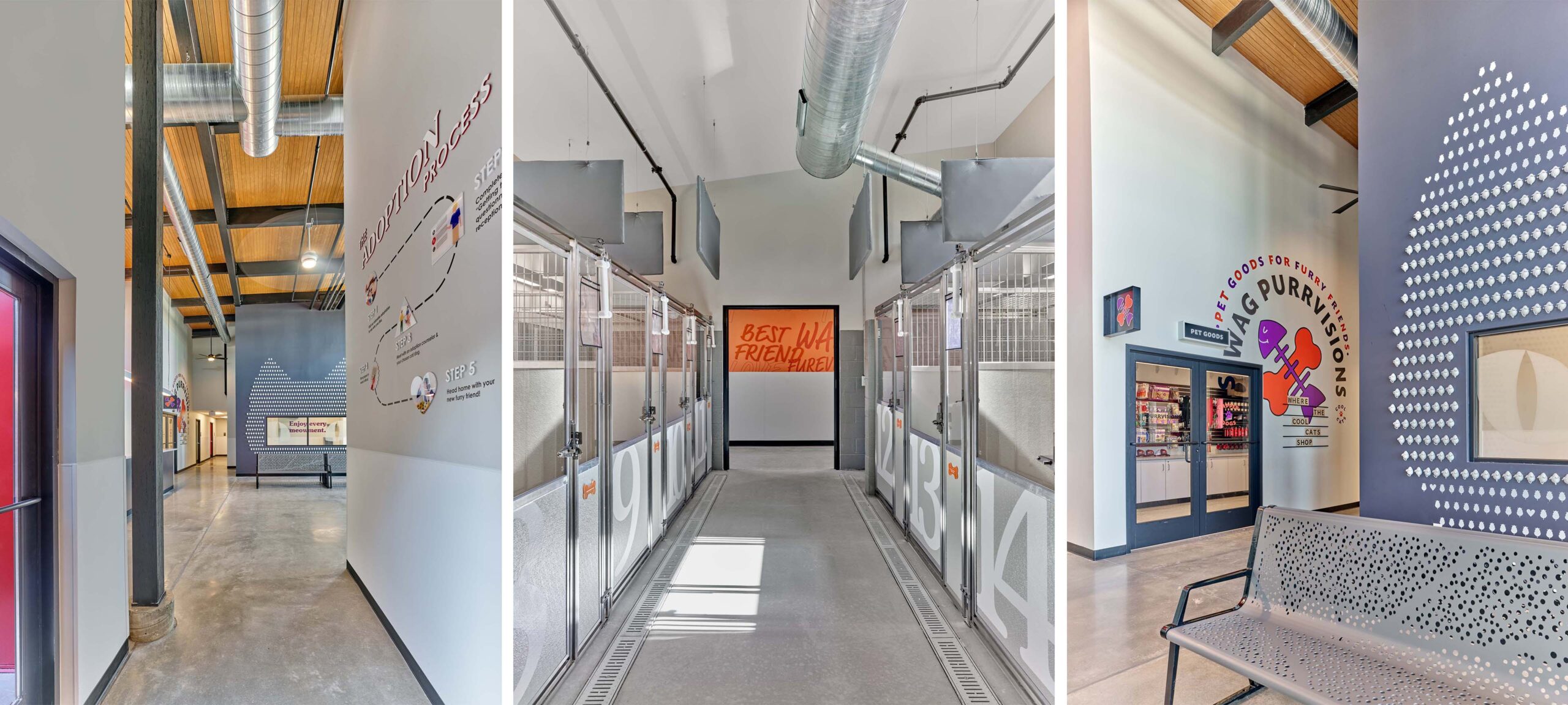 When the SPCA’s new, ground-up facility was almost complete, D2 was called to weave a story through the space with powerful environmental graphics, wayfinding, and messaging. The challenge was big space, modest budget, and just three months to design, fabricate, and install. The SPCA’s vision for the space, “happy”, is brought to life through color, bold installations, whimsical messaging inspired by our love for our furry friends, and full of cheery wordplay. A large installation of three-dimensional mice forms the shape of a cat around a viewing window while a tennis ball installation opposite the lobby forms the shape of a dog. A pet supply store is named, S’Wag Purrvisions: Where the Cool Cats Shop, and the exam room entrances are filled with words of love so that our best friends can feel Pawlbetter! In addition to the Veterinary Clinic and shop, the building houses an Adoption Center and Community Center. All spaces are unified by the same brand strategy and no space, not even the dog baths aka ‘The Dirty Dog’, are left without some loving brand attention.