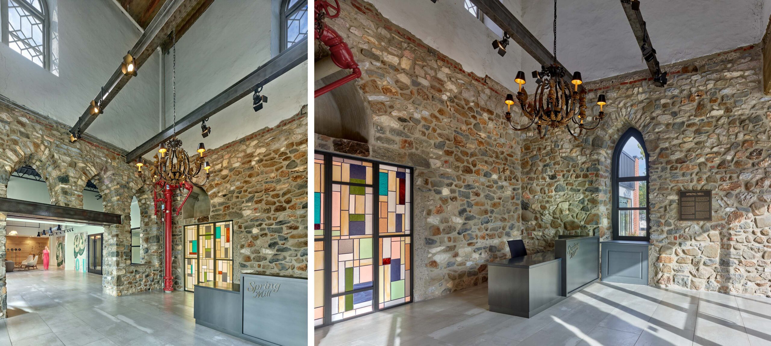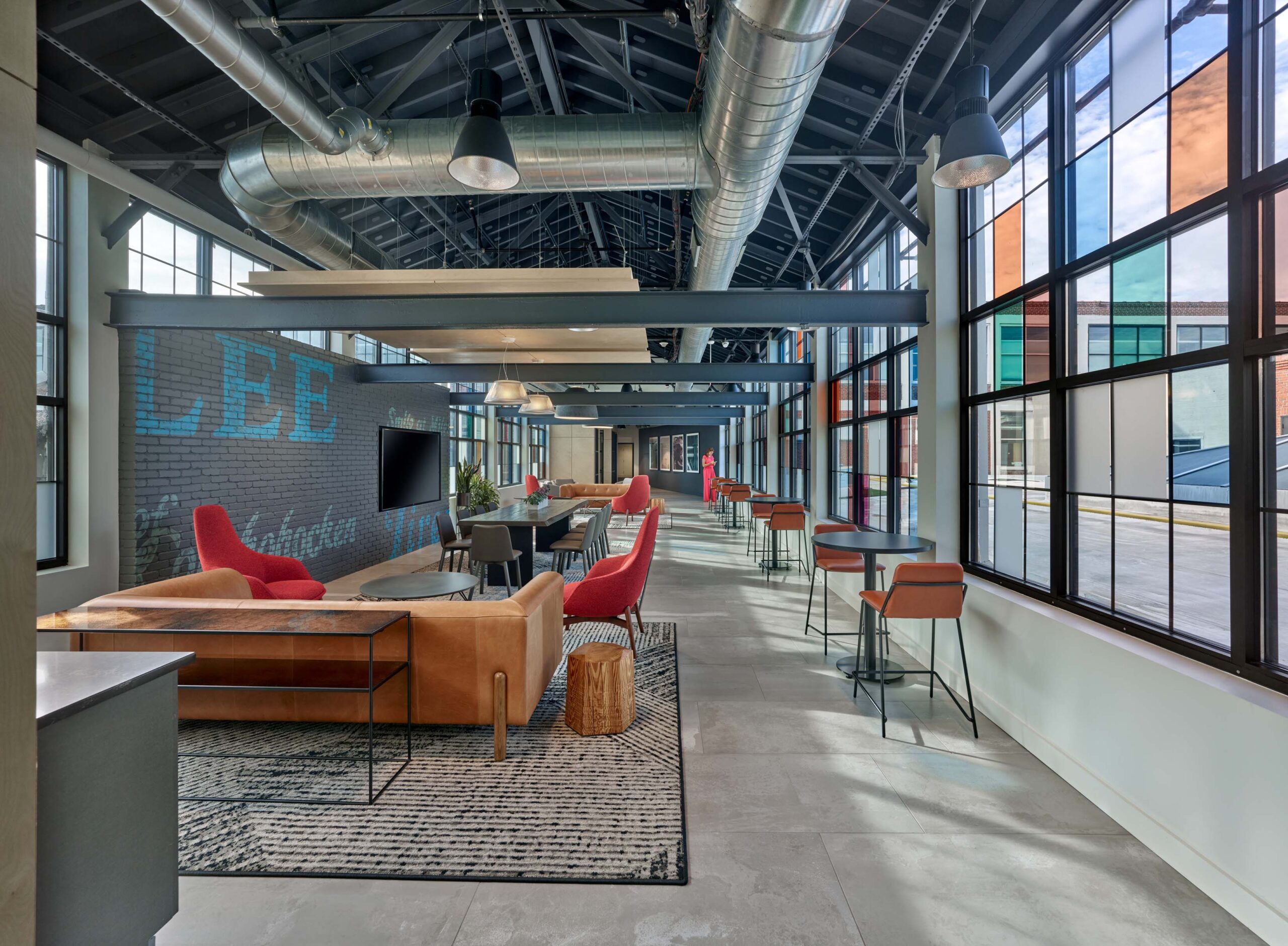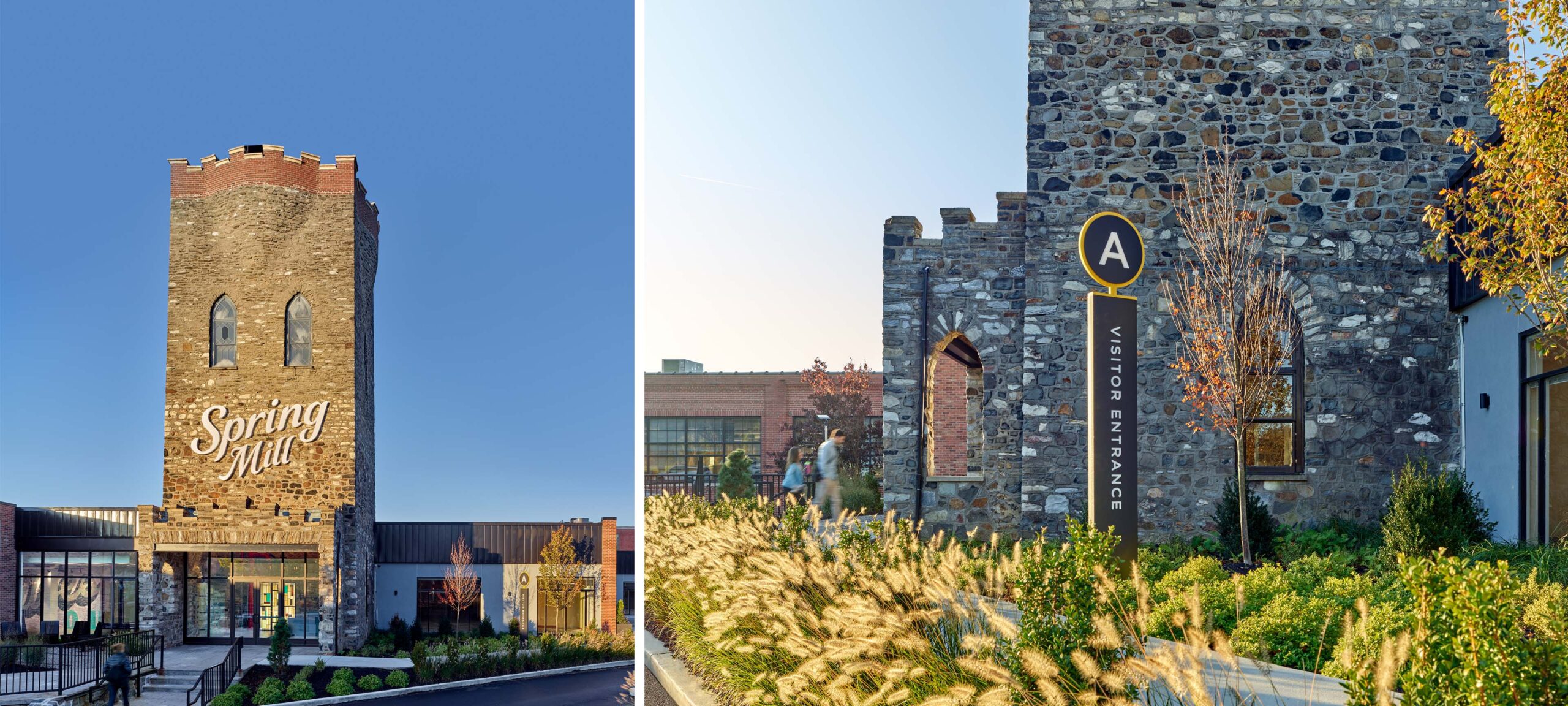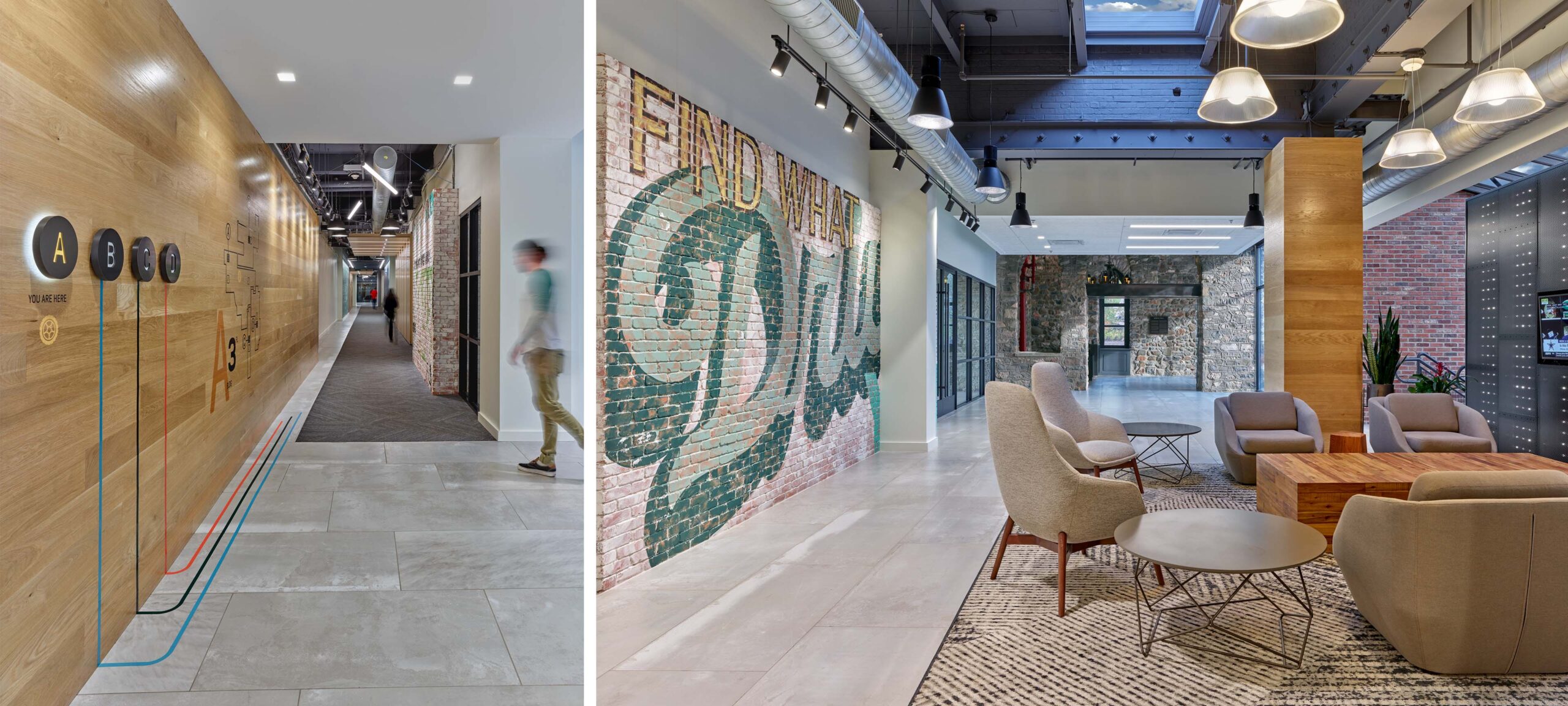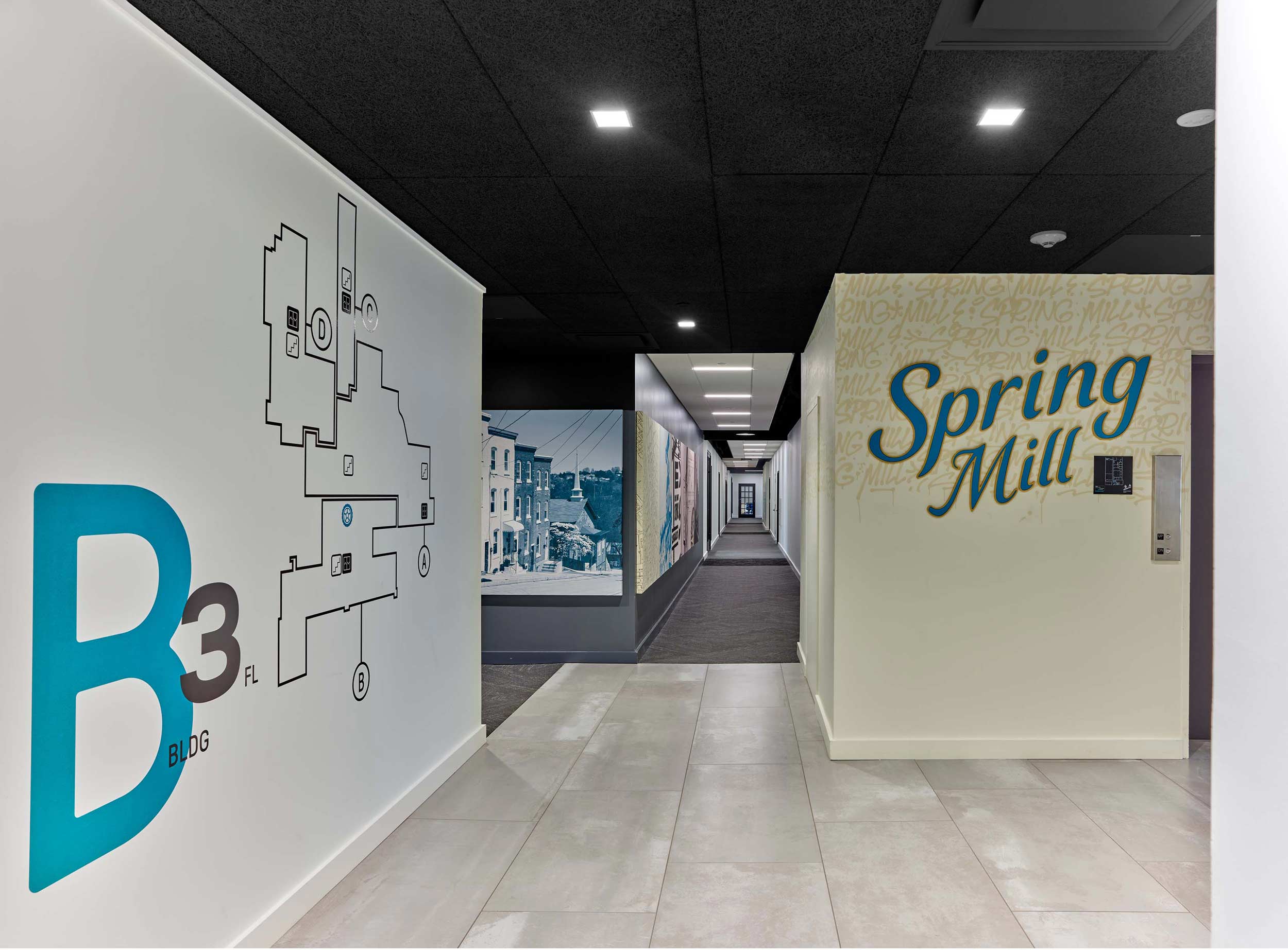 From 1887 factory building to a multi-building creative office campus today, Spring Mill has gone through 125 years of conversions. D2 was brought on by real estate investor, Alliance HP, to further transform the property from street approach to interior experience. Wayfinding and signage ease navigation to and through the 500,000 square foot campus with creative installations that reflect the new Spring Mill brand and form cohesion among previously disparate buildings. Multiple main entry points were consolidated into one and, once a labyrinth of corridors, the interior circulation is now an easy course full of interest, landmarks, and thoughtful directional signage. The exterior and interior have been updated to reflect the site’s industrial roots with newly exposed structure, concrete floors, and the addition of painted brick, and raw woods. Artwork and environmental graphics along with residential furniture settings create comfortable environments that are no longer a series of pass throughs – they are places for congregation, socialization, and cultural events for tenants and for the local community. The renovations have revitalized the aging campus and created a highly desirable workplace that has become a hub for businesses looking for creative space, urban walkability, and connection to a vibrant neighborhood community.