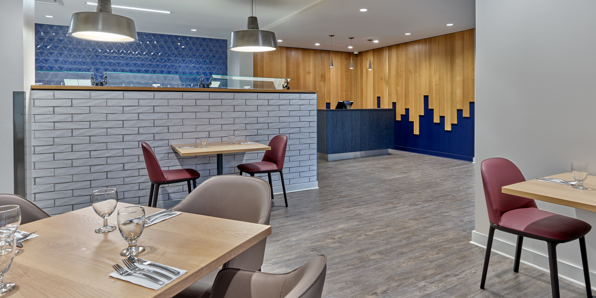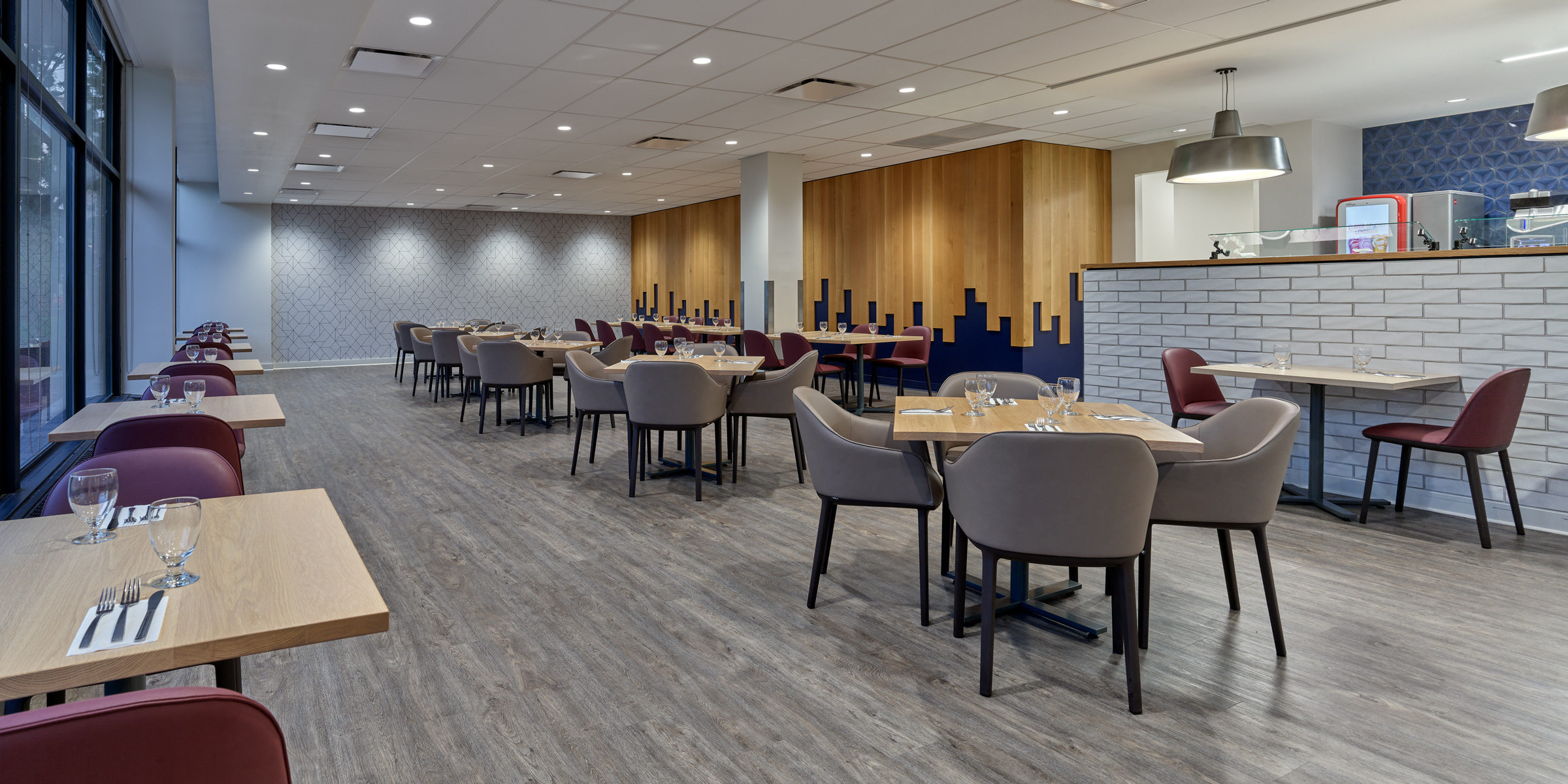 To differentiate the entrance from the student dining hall, D2 upgraded the existing aluminum facade, blanketing it in cherry-red for stunning visibility. A new staircase and ramp leads guests into the moody and sleek interior. In the daylight, large panels of glass allow natural light inside, revealing a fresh mix of neutral wood tones and saturated accents for a space that is as cozy as it is refined. At night, the soft glow of upgraded lighting illuminates from within, inviting guests to come in and take a seat.