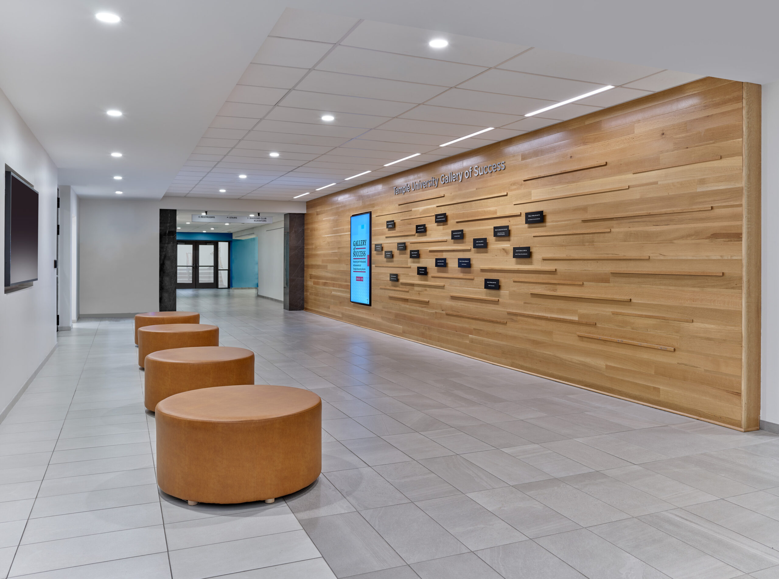 Comprised of two separate buildings, Mitten Hall is now fused together via a main corridor, consolidating the building’s lower level. Paying homage to decades of Temple Pride, we outfitted the corridor with a branded feature wall that welcomes guests and showcases Temple alumni who have made outstanding contributions to society. This “Gallery of Success” is a mix of past and present, symbolic of the hall itself and designed to inspire future generations of Owls who dare to change the world