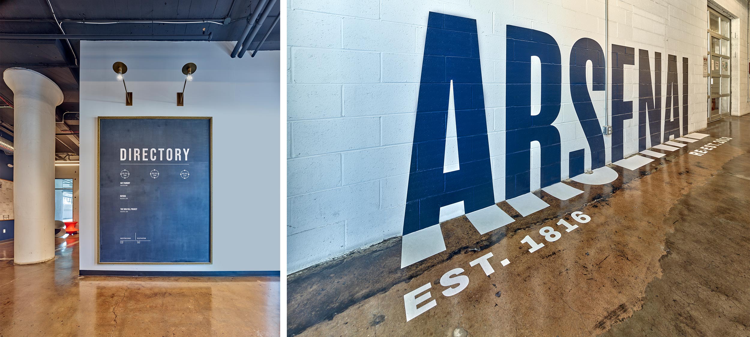 The Arsenal, dating back to 1816, was originally a center for US military small-arms ammunition design and development. After some years of vacancy and disregard, D2 was brought on to reimagine the purpose of five multi-story loft space buildings, totaling 208,000 SF. The new design offers the community a space for creative flex office, light industrial manufacturing, and a neighborhood café. Entrances celebrate the rich history of the buildings and their site and offer tenants a shared kitchen amenity. Keeping the architectural character fully intact, we preserved the quirky old interior halls that weave through the floors and connect the buildings. Layered with crisp wayfinding and eclectic artwork, the revitalized design celebrates a good life long lived.